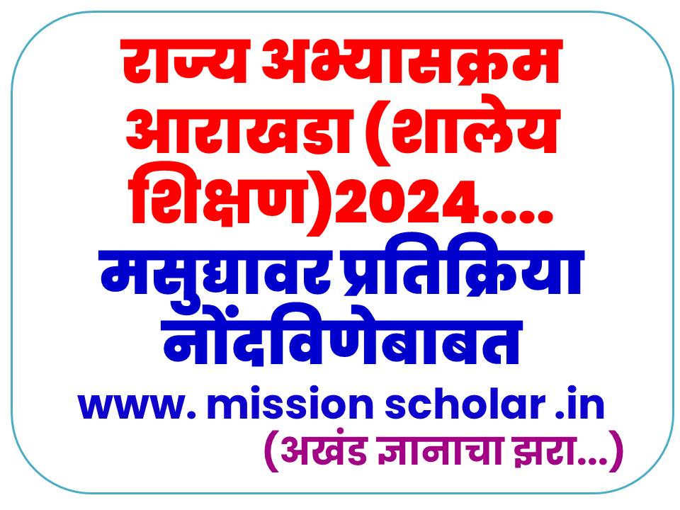 राज्य अभ्यासक्रम आराखडा (शालेय शिक्षण)- 2024 मसुद्याबाबत सर्व समाज घटक, शिक्षक, पालक, शिक्षण तज्ज्ञ, शैक्षणिक प्रशासन यांनी आपले अभिप्राय दिनांक 3 जून 2024 पर्यंत परिषदेच्या https://forms.gle/TDHL९z८harzRgJoy५ या लिंक वर नोंदवावेत अथवा पोस्टाने पाठवावेत, असे आवाहन करण्यात आले आहे. अभिप्राय नोंदवत असतांना त्यामध्ये आपले नाव, मोबाइल क्रमांक, इमेल, पत्ता, कार्यालय, जिल्हा आदी तपशील देण्यात यावा. अभिप्राय व सूचना सप्रमाण व सकारण नोंदविल्या जाव्यात. त्यामध्ये क्षेत्र, विषय, स्तर, पृष्ठ क्रमांक, मूळ मसुद्यातील तपशील, आवश्यक बदल, बदलाचे कारण, कोणत्या मुद्द्यामध्ये दुरुस्ती आवश्यक वाटते याचा तपशील, सुधारित मजकूर कसा असावा, याचा समावेश असावा.