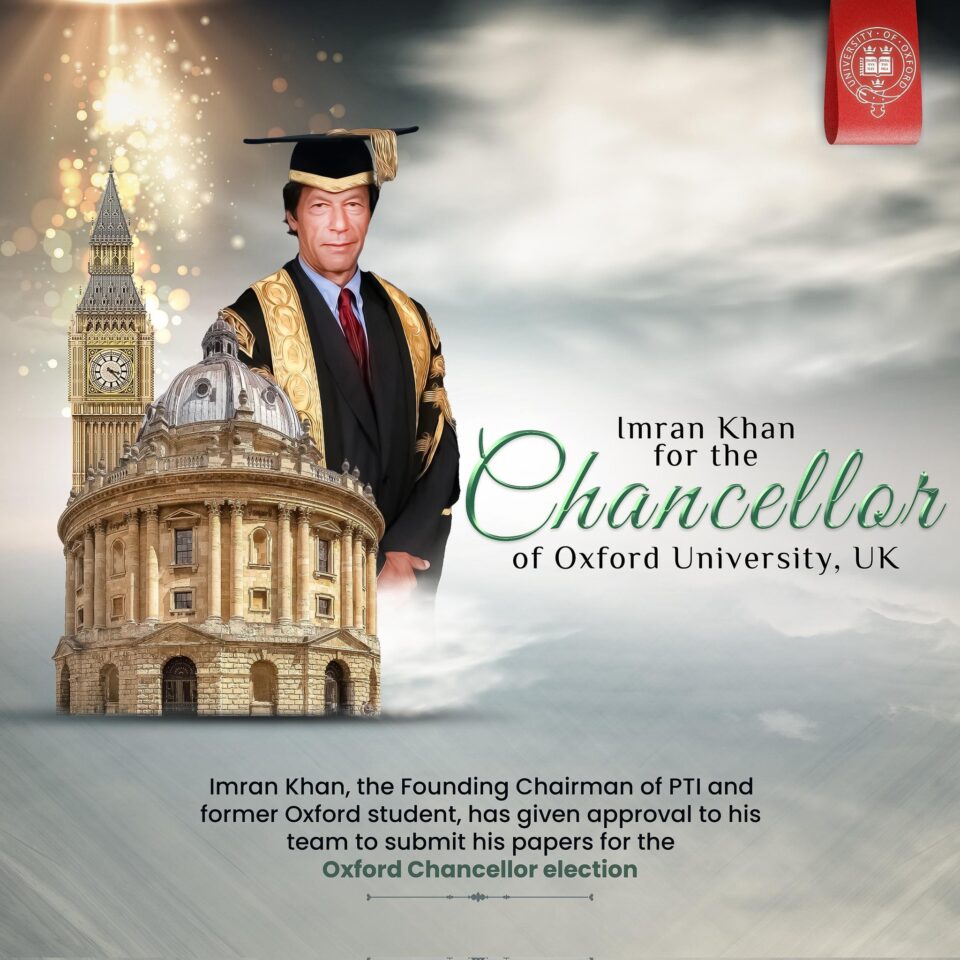 पाकिस्तानच्या तुरुंगात असलेले माजी प्रधान मंत्री इमरान खान यांनी कुलपती होण्यासाठी केला अर्ज याबाबत पीटीआय प्रमुख, ऑक्सफर्डचे माजी विद्यार्थी, यांनी त्यांच्या पक्षाचे लंडनस्थित प्रवक्ते सय्यद झुल्फिकार बुखारी यांच्यामार्फत प्रतिष्ठित विद्यापीठाचे पुढील कुलगुरू होण्यासाठी औपचारिकपणे विनंती केली आहे. माहितीनुसार, ऑक्सफर्ड विद्यापीठाच्या कुलपतींच्या 10 वर्षांच्या कार्यकाळातील उमेदवारांची यादी ऑक्टोबरपर्यंत गोपनीय राहील, असे विद्यापीठाच्या वेबसाइटवर नमूद करण्यात आले आहे