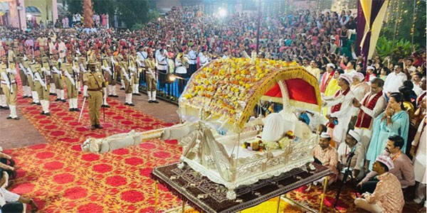 रायगड प्रतिनिधी :- जिल्ह्याचे श्रध्दास्थान आणि रोहयाचे ग्रामदैवत श्री धाविर महाराजांच्या पालखी सोहळ्यास दरवर्षी रायगड पोलीस दलामार्फत सशस्त्र मानवंदना देण्यात येते. ब्रिटिश कालीन परंपरा असलेला ही मानवंदना अतिशय भव्य आणि दिमाखदार स्वरूपात करण्याचे निर्देश पालकमंत्री उदय सामंत यांनी मागील वर्षी दिले होते. त्यानुसार यंदा रायगड पोलिसांनी धावीर महाराजांना अतिशय भव्य आणि दिमाखदार सशस्त्र मानवंदना दिली.