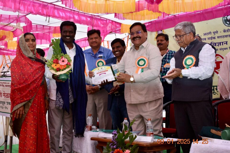 फोटो ओळी…..८-केंद्रीय कापूस संशोधन संस्था, नागपूर व वसंतराव नाईक कृषी विद्यापीठ यांच्या संयुक्त विद्यमान कापूस प्रकल्पामध्ये विशेष योगदान दिल्याबद्दल बाजार गेवराई येथील प्रगतशिल शेतकरी कृष्णा कान्हेरे यांचा सपत्नीक गौरव करुन मान्यवरांच्या हस्ते पुरस्कार प्रदान करण्यात आ