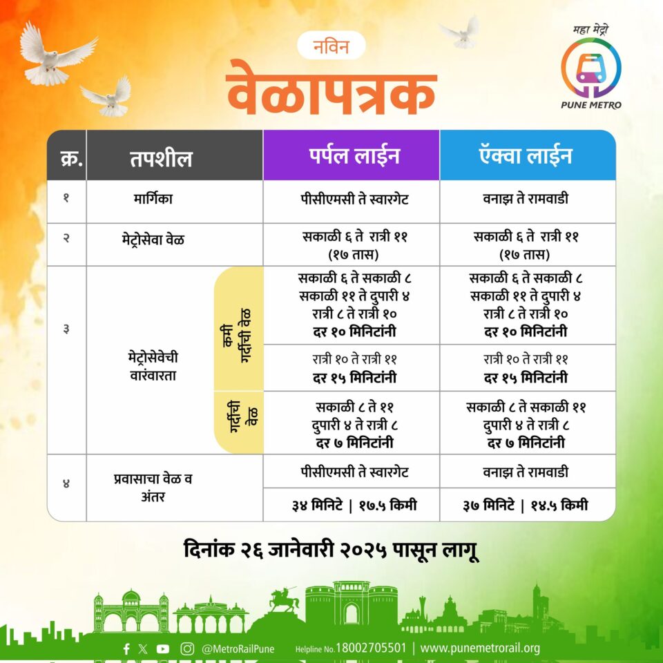 आजपासून पुणे मेट्रोची प्रवासी सेवा रात्री 11 वाजेपर्यंत सुरू राहणार आहे. सकाळी सहा वाजल्यापासून रात्री 11 वाजेपर्यंत प्रवास करता येणार आहे. प आज प्रजासत्ताक दिनापासून पुणे मेट्रो च्या वेळापत्रकात बदल करण्यात आले आहेत. प्रवाशांना पुणे मेट्रोने प्रवास अधिक सुलभ व जलद करता यावा याउद्देशाने पुणे मेट्रोचे ‘एक पुणे ट्रांझिट कार्ड’ 26 जानेवारी 2025 रोजी प्रजासत्ताक दिनी पहिल्या 5000 प्रवाशांसाठी विशेष सवलतीसह उपलब्ध असतील. नेहमी 118 रुपये शुल्क असणारे हे कार्ड प्रवाशांसाठी केवळ 20 रुपयांत उपलब्ध असणार आहेत. हे कार्ड खरेदी करण्यासाठी कुठल्याही कागदपत्रांची आआवश्यकता नसणार असल्याचे सूत्रांकडून कळते