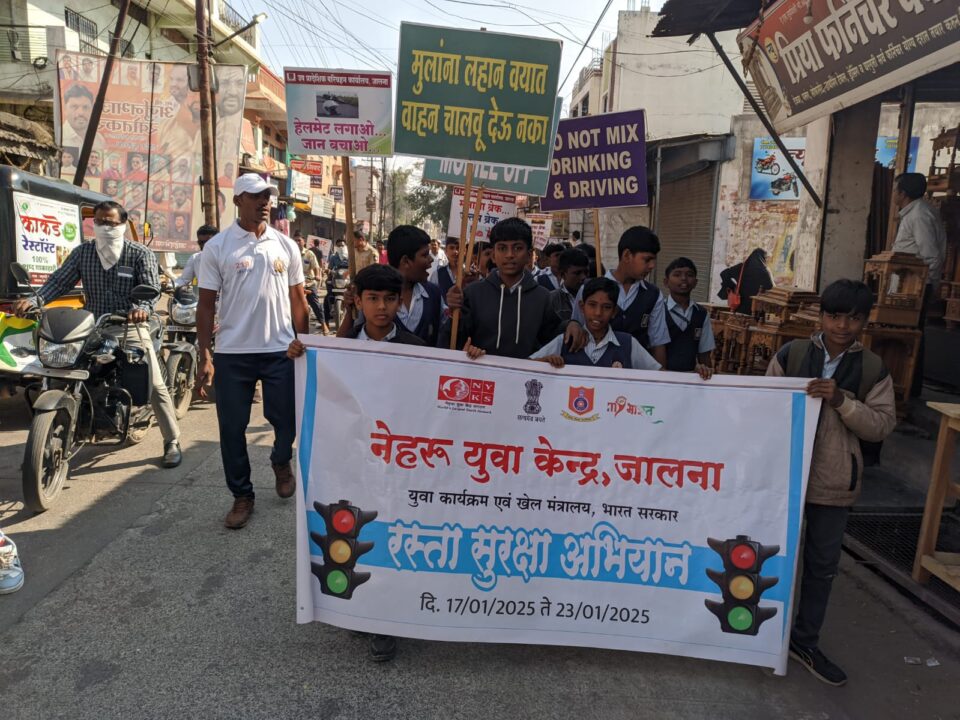 जालना प्रतिनिधी: रस्ता सुरक्षा अभियानाच्या जनजागृतीसाठी जालना येथे गांधी चमन ते मोतीबाग मार्गावर भव्य मॅरेथॉन व वॊकेथॉन रॅलीचे आयोजन करण्यात आले. या अभियानाचे आयोजन उप-प्रादेशिक परिवहन कार्यालय, नेहरू युवा केंद्र, पोलीस प्रशिक्षण केंद्र, आणि युवा बहुद्देशीय सेवाभावी संस्था यांच्या संयुक्त विद्यमाने करण्यात आले.