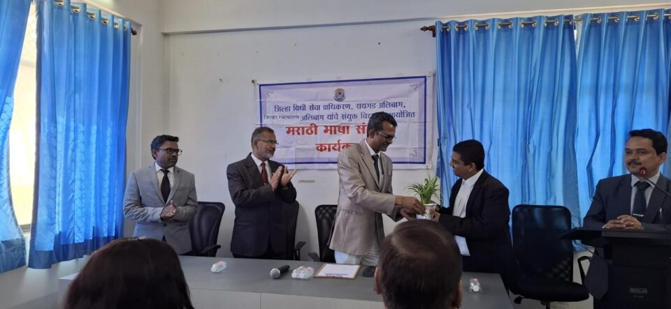 या कार्यक्रमात विधीज्ञ ॲड. श्रीराम ठोसर यांनी “न्यायालयीन कामकाजात मराठी भाषेचा वापर” या विषयावर मार्गदर्शन केले.कार्यक्रमाच्या अध्यक्षस्थानी प्रमुख जिल्हा व सत्र न्यायाधीश ए. एस. राजंदेकर होते, तर प्रमुख जिल्हा न्यायाधीश क. 2 एन. के. मणेर, जिल्हा न्यायाधीश भगत, विधीज्ञ ॲड. श्रीराम ठोसर आणि रायगड जिल्हा विधी सेवा प्राधिकरण सचिव तथा वरिष्ठ न्यायाधीश अमोल शिंदे आदी मान्यवर उपस्थित होते.