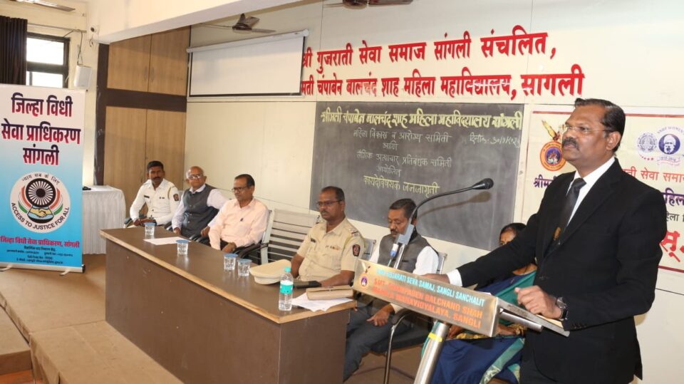 सांगली, प्रतिनिधी.) : महाराष्ट्र राज्य विधी सेवा उच्च न्यायालय मुंबई यांच्याकडील कॉमन मिनीमम प्रोग्रॅमनुसार जिल्हा विधी सेवा प्राधिकरण सांगली यांच्या वतीने चंपाबेन बालचंद शाह महिला महाविद्यालय सांगली येथे बालकांचे लैंगिक अपराधापासून संरक्षण अधिनियम कायदा 2012 (POCSO ACT) व रस्ते सुरक्षा व वाहतुकीचे नियम याबाबत जनजागृती संबंधित कायदेशीर साक्षरता या कायदेविषयक शिबिराचे आयोजन करण्यात आले. हे शिबिर जिल्हा विधी सेवा प्राधिकरणाचे सचिव गि. ग. कांबळे यांच्या अध्यक्षतेखाली संपन्न झाले.