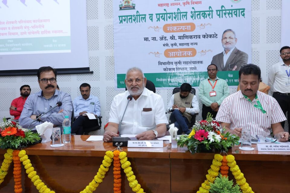 कृषिमंत्री श्री.कोकाटे यांच्या संकल्पनेतून प्रगतशील व प्रयोगशील शेतकरी परिसंवादाचे आयोजन विभागीय पातळीवर करण्यात आले. या अंतर्गत कोकण विभागातील ठाणे, पालघर, रायगड, रत्नागिरी, सिंधुदुर्ग या जिल्ह्यातील शेतकऱ्यांशी संवाद आणि चर्चा कार्यक्रमाचे आयोजन जिल्हाधिकारी कार्यालयातील नियोजन भवन येथे करण्यात आले होते. यावेळी ते बोलत होते.