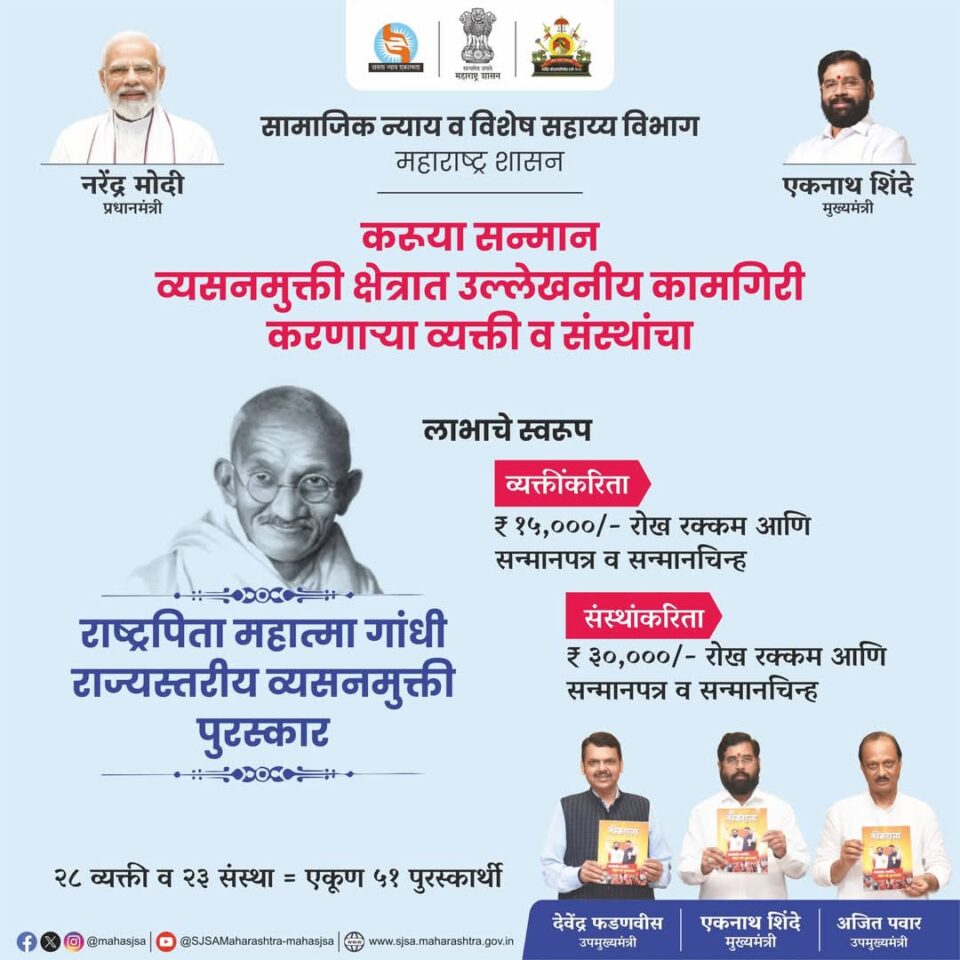 राज्य प्रतिनिधी सांगली : सन २०२०-२०२१, २०२१-२०२२, २०२२-२०२३, २०२३-२०२४ व २०२४-२०२५ या पाच वर्षांकरिता व्यसनमुक्ती क्षेत्रात कार्य करणाऱ्या व्यक्ती व संस्था यांच्याकडून राष्ट्रपिता महात्मा गांधी राज्यस्तरीय व्यसनमुक्ती सेवा पुरस्कारासाठी 22 फेब्रुवारी 2025 पर्यंत अर्ज मागविण्यात आले आहेत. व्यक्ती व संस्थांनी प्रत्येक वर्षासाठी स्वतंत्र अर्ज करणे आवश्यक आहे. व्यसनमुक्ती क्षेत्रात उत्कृष्ट व उल्लेखनीय कार्य करणाऱ्या व्यक्ती व संस्था यांनी यासाठी अर्ज करावेत, असे आवाहन सामाजिक न्याय व विशेष सहाय्य विभागाचे प्रधान सचिव हर्षदीप कांबळे व समाज कल्याण आयुक्त ओम प्रकाश बकोरिया यांनी प्रसिध्दीपत्रकाव्दारे केले आहे.