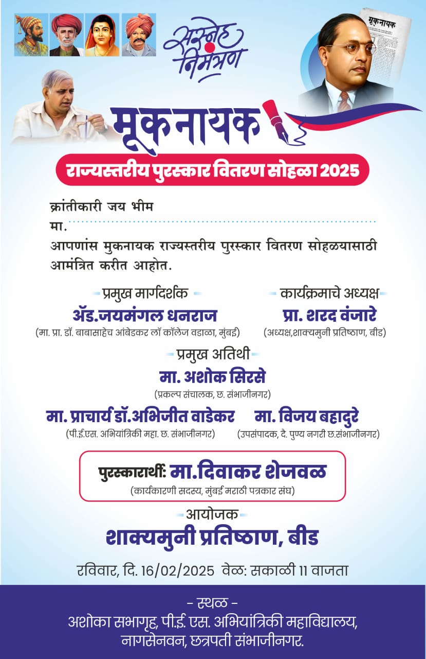 छत्रपती संभाजीनगर प्रतिनिधी-: डॉ.बाबासाहेब आंबेडकर यांच्या ‘ मूकनायक ‘ या पाक्षिकामागील सामाजिक जाणीव आणि बांधिलकी जपणाऱ्या पत्रकारितेचा वारसा जतन करण्यासाठी मराठवाड्यातील ‘शाक्यमुनि प्रतिष्ठानने यंदा राज्यस्तरीय ‘मूकनायक पुरस्कार’ सुरू केला आहे. पहिल्या वर्षातील या प्रतिष्ठेच्या पुरस्कारासाठी ज्येष्ठ पत्रकार दिवाकर शेजवळ यांची निवड करण्यात आली आहे. रविवारी १६ फेब्रुवारी २०२५ रोजी सकाळी ११ वाजता पी.ई.एस. अभियांत्रिकी महाविद्यालयाच्या अशोका हॉल येथे आयोजित कार्यक्रमात दिवाकर शेजवळ यांना राज्यस्तरीय ‘मूकनायक पुरस्कार’ देऊन सन्मानित करण्यात येणार आहे.