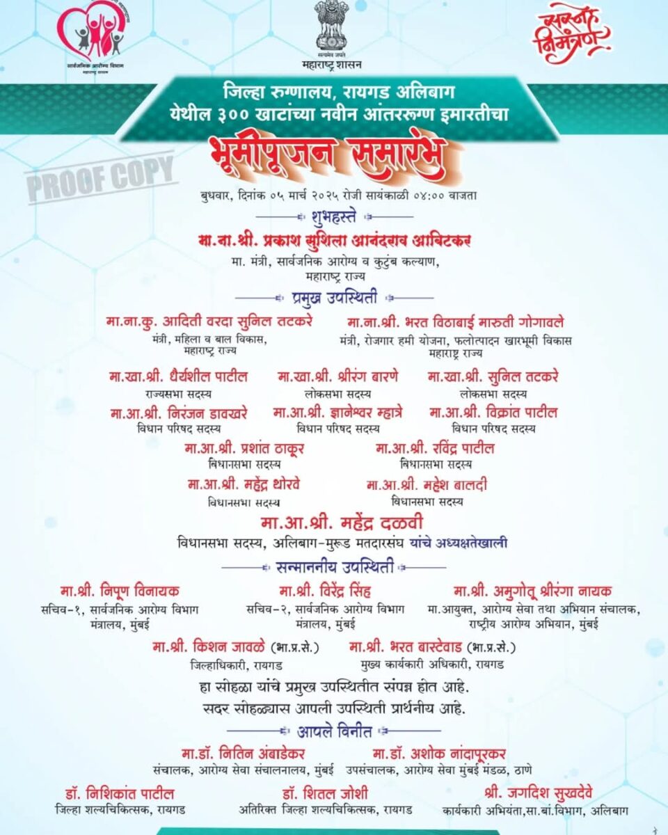 रायगड( प्रतिनिधी:- अलिबाग येथील जिल्हा रुग्णालय,रायगड च्या 300 खाटांच्या नवीन आंतररुग्ण इमारतीच्या बांधकामाचे भूमिपूजन बुधवार दि.05 मार्च रोजी सायंकाळी 4.00 वा.सार्वजनिक आरोग्य व कुटुंब कल्याण मंत्री प्रकाश आबिटकर यांच्या शुभहस्ते तर महिला व बाल विकास मंत्री कु.आदिती तटकरे तसेच रोजगार हमी योजना, फलोत्पादन व खारभूमी विकास मंत्री भरत गोगावले यांच्या प्रमुख उपस्थितीत संपन्न होणार आहे.