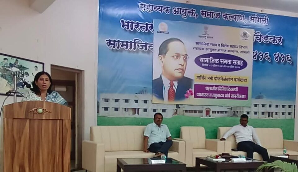 सांगली, प्रतिनिधी : भारतरत्न डॉ. बाबासाहेब आंबेडकर सामाजिक समता सप्ताह निमित्त आज सहाय्यक आयुक्त समाज कल्याण कार्यालय सांगली येथे मार्जिन मनी योजनेंतर्गत कार्यशाळेचे आयोजन करण्यात आले. या कार्यशाळेस जिल्हा उद्योग केंद्राच्या महाव्यवस्थापक विद्या कुलकर्णी, समाज कल्याण कार्यालयाचे सहाय्यक आयुक्त नितीन उबाळे, नवउद्योजक अर्जन सकट, अभिजीत गोंधळे आदि उपस्थित होते.