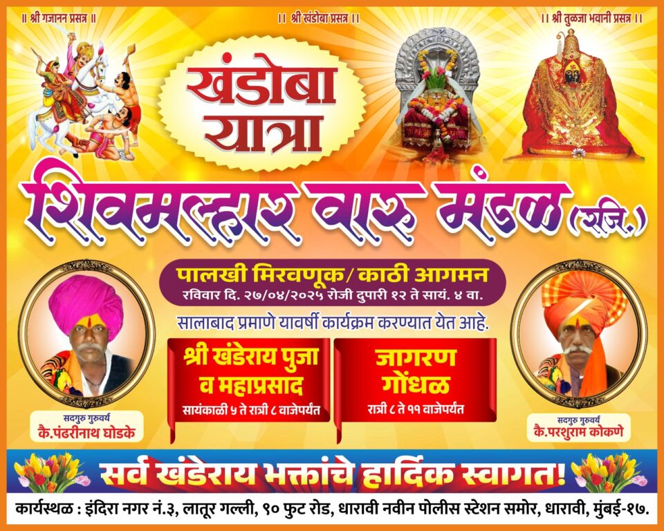 सालाबदाप्रमाणे याही वर्षी शिव मल्हार वारू मंडळ खंडोबा यात्रा आयोजन केले आहे. यामध्ये काठी अंगमन आणि पालखी मिरवणूक काढण्यात येत आहे. सदर कार्यक्रम धारावी 90 रोड लातूर गल्ली मैदानात आयोजित करण्यात आला आहे. खंडोबा यांच्या यात्रेला ज्याला जाता आले नाही त्या सर्व भक्तांना या यात्रेच्या माध्यमातून पालखी दर्शन काठी अंगमन आणि महाप्रसादाचा लाभ घ्यावा जेणेकरून खंडोबा रायाची सर्वांवर कृपा राहणार आहे याकरिता सर्वांनी सदर कार्यक्रमाला उपस्थित राहून यात्रेचा आनंद घ्यावा असे आवाहन आयोजक मंडळांनी केले आहे.