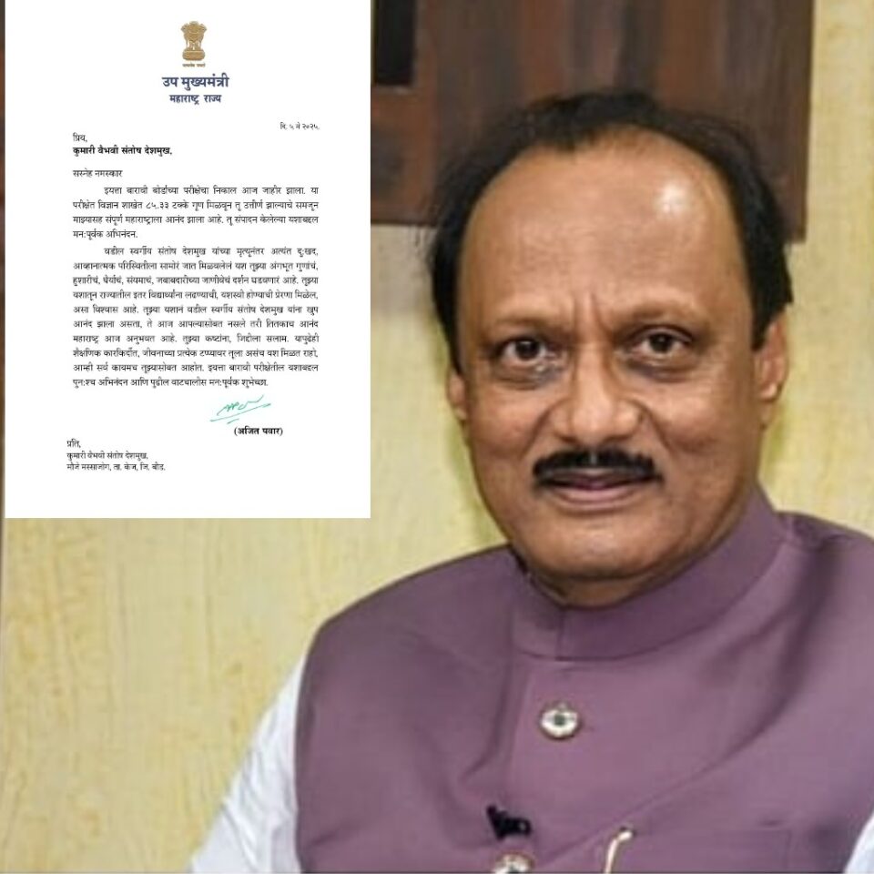 वैभवी देशमुख हिला पाठविलेल्या अभिनंदनपर पत्रात उपमुख्यमंत्री अजित पवार यांनी म्हटले आहे की, “इयत्ता बारावी बोर्डाच्या परीक्षेचा निकाल आज जाहीर झाला. या परीक्षेत विज्ञान शाखेत 85.33 टक्के गूण मिळवून तू उत्तीर्ण झाल्याचे समजून माझ्यासह संपूर्ण महाराष्ट्राला आनंद झाला आहे. वडील दिवंगत संतोष देशमुख यांच्या मृत्यूनंतर अत्यंत दु:खद, आव्हानात्मक परिस्थितीला सामोरे जात मिळवलेले यश तुझ्या अंगभूत गुण, हुशारी, धैर्य, संयमाचे, जबाबदारीच्या जाणीवेचे दर्शन घडवणारे आहे. तुझ्या यशातून राज्यातील इतर विद्यार्थ्यांना लढण्याची, यशस्वी होण्याची प्रेरणा मिळेल, असा विश्वास आहे. तुझ्या यशाने वडील स्वर्गीय संतोष देशमुख यांना खुप आनंद झाला असता. तुझ्या कष्ट, जिद्दीला सलाम. यापुढेही शैक्षणिक कारकिर्दीत, जीवनाच्या प्रत्येक टप्प्यावर तुला असंच यश मिळत राहो, आम्ही सर्व कायमच तुझ्यासोबत आहोत,” असा विश्वास देत उपमुख्यमंत्री पवार यांनी तिच्या पुढील वाटचालीस शुभेच्छा दिल्या आहेत.