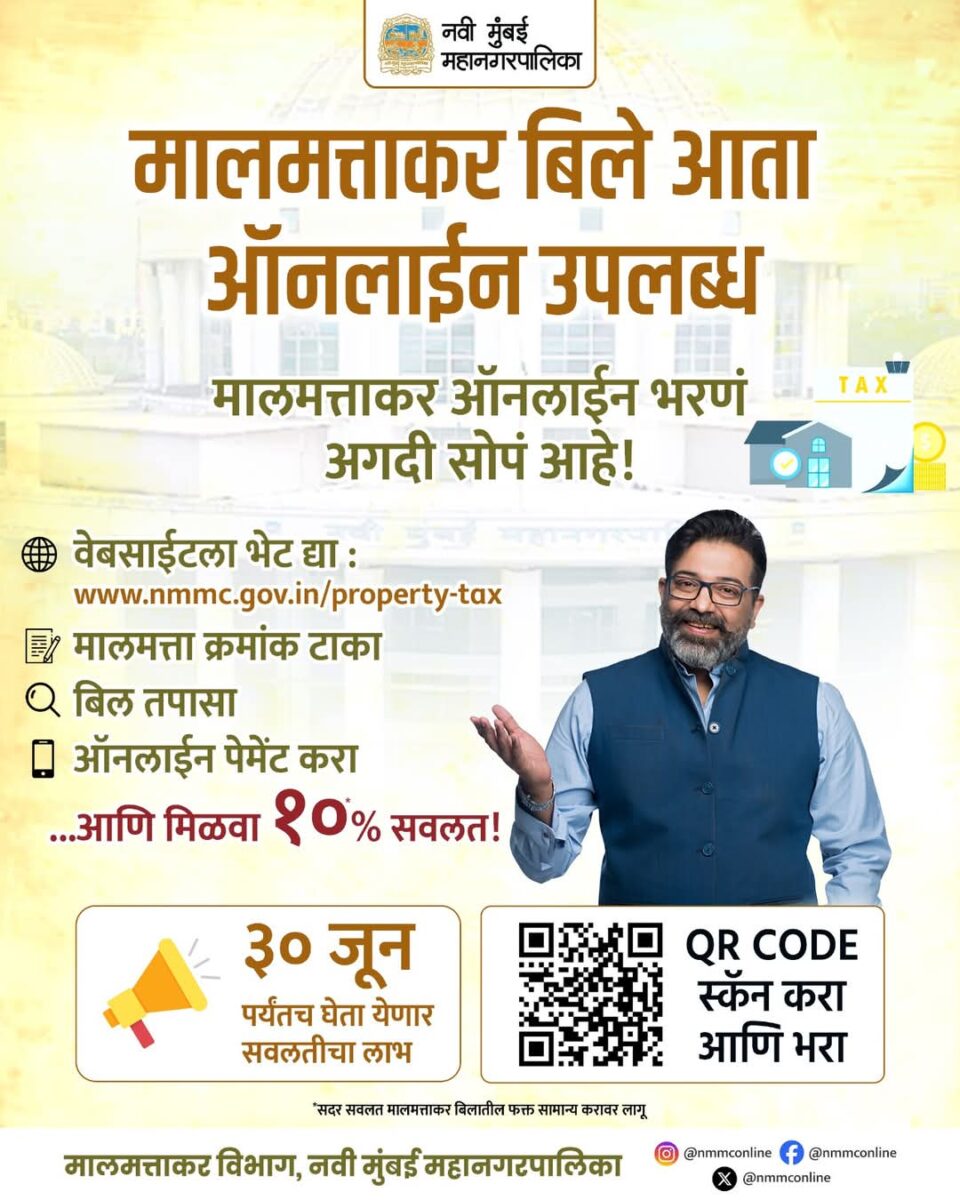 *आर्थिक वर्ष २०२५-२६ ची मालमत्ताकर बिले आता ऑनलाईन उपलब्ध* नवी मुंबई महानगरपालिकेने आर्थिक वर्ष २०२५-२६ ची मालमत्ताकर बिले आता ऑनलाईन उपलब्ध करून दिली आहेत. नागरिकांना आपले कराचे बील घरबसल्या, कुठेही आणि केव्हाही पाहता व भरता यावे यादृष्टीने महानगरपालिकेच्या www.nmmc.gov.in या अधिकृत संकेतस्थळावर तसेच ‘MY NMMC – माझी नवी मुंबई’ या ॲपवर मालमत्ताकर बिले उपलब्ध करून देण्यात आलेली आहेत. नागरिकांनी आपले मालमत्ताकर बिल ३० जून २०२५ पर्यंत भरल्यास बिलातील सामान्य करावर १०% सवलतीचा लाभ मिळवता येणार आहे. ही मालमत्ता धारक नागरिकांसाठी सुवर्णसंधी आहे.