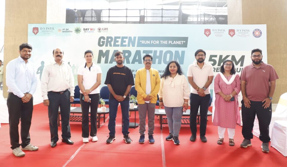 आज डॉ.डी.वाय.पाटील समुहाचे अध्यक्ष श्री.विजय पाटील यांच्या मार्गदर्शनानुसार डी.वाय.पाटील क्लायमेट ॲक्शन लॅबमार्फत डॉ.डी.वाय.पाटील स्टेडिअमपासून सुरू झालेल्या व नेरूळ पूर्व परिसरात निश्चित केलेल्या मार्गाने पुन्हा स्टेडिअमजवळ सांगता झालेल्या 5 किमी. अंतराच्या ग्रीन मॅरेथॉनमध्ये युवक, युवती मोठ्या संख्येने सहभागी झाले होते. महानगरपालिकेच्या वतीने उद्यान विभागाचे उपआयुक्त श्री.किसनराव पलांडे, घनकचरा व्यवस्थापन विभागाचे उपआयुक्त डॉ.अजय गडदे, क्रीडा व सांस्कृतिक कार्य विभागाच्या उपआयुक्त श्रीम.अभिलाषा म्हात्रे, विजय पाटील स्कुल ऑफ मॅनेजमेंटच्या कॉर्पोरेट रिलेशन मॅनेजर डॉ.विद्या श्रीनिवास यांनी झेंडा दाखवून ग्रीन मॅरेथॉनचा शुभारंभ केला. नेरूळ विभागाचे सहा. आयुक्त श्री.जयंत जावडेकर यांनी ग्रीन मॅरेथॉनमध्ये प्रत्यक्ष सहभाग घेतला होता.    ‘पर्यावरण विघातक प्लास्टिकला नकार आणि कापडी पिशव्यांचा करू स्विकार’, ‘से नो टू प्लास्टिक’, ‘प्लास्टिकचा वापर टाळूया – पर्यावरण जपूया’ अशा घोषवाक्यांचे फलक उंचावत या ग्रीन मॅरेथॉनमध्ये 200 हून अधिक नागरिक सहभागी झाले होते. यामध्ये युवक-युवतींची संख्या लक्षणीय होती. या ग्रीन मॅरेथॉनमधील विजेत्यांना सन्मानचिन्हे व मेडल्स देऊन गौरविण्यात आले. या माध्यमातून शाश्वत पर्यावरण विकासासाठी एक यशस्वी धाव घेण्यात आली.