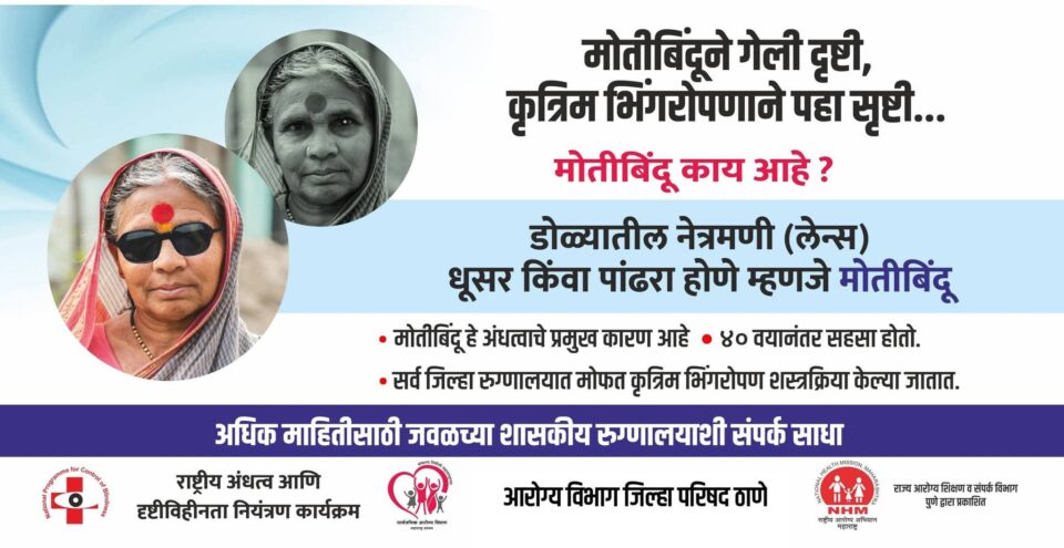 ठाणे प्रतिनिधी (जिल्हा परिषद, ठाणे) – महाराष्ट्र शासनाच्या सार्वजनिक आरोग्य विभागामार्फत राज्यभर “मोतीबिंदू मुक्त महाराष्ट्र” हे विशेष अभियान २२ जुलै, २०२५ ते २२ ऑगस्ट, २०२५ या कालावधीत राबवण्यात येत आहे. या अभियानाचा मुख्य उद्देश म्हणजे मोतीबिंदूसारख्या आजारामुळे होणाऱ्या अंधत्वाचे उच्चाटन करणे आणि नेत्रविकाराच्या लवकर निदानासाठी नागरिकांमध्ये जागरूकता निर्माण करणे.