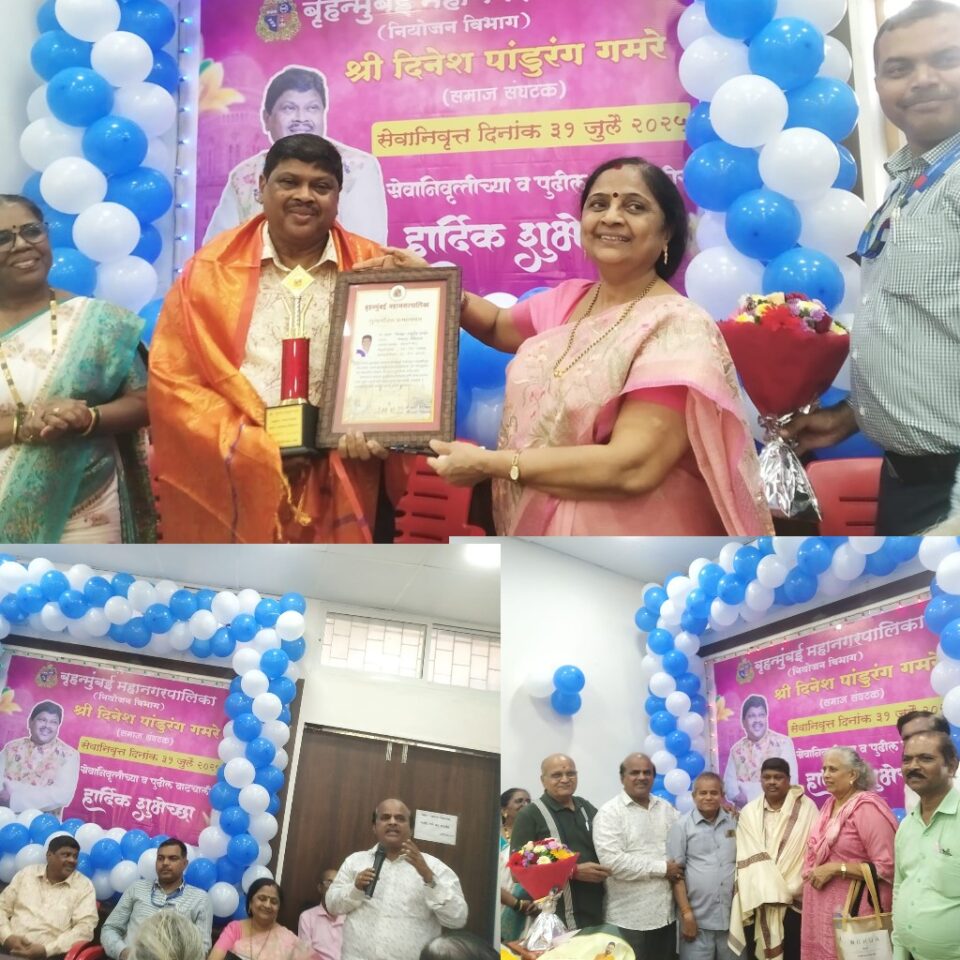 गेली सदतीस वर्ष महानगरपालिका शिक्षण विभागासह नियोजन विभागात कार्यरत असणारी समाज संघटक श्री दिनेश पांडुरंग गमरे हे दिनांक 31 जुलै 2025 रोजी नियोजन विभागातून सन्मानपूर्वक सेवानिवृत्त झाले त्यावेळी नियोजन विभागातील दादर येथील सभागृहात दुपारी तीन ते पाच या वेळात श्री गमरे यांचा खात्यांतर्गत व आजी-माजी कर्मचारी हितचिंतक नातेवाईक यांच्या उपस्थितीत सेवानिवृत्ती सत्कार सोहळ्याचे आयोजन करण्यात आले होते त्यावेळी व्यासपीठावर प्रशासकीय अधिकारी नियोजन श्रीमती शशिकला पाटील मुख्य समाज विकास अधिकारी श्री भास्कर जाधव सत्कारमूर्ती श्री दिनेश गमरे व त्यांच्या पत्नी स्नेहा गमरे यांच्यासह शिक्षण विभाग समाजसेवा प्रकल्प माजी प्रमुख समन्वय श्रीमती गीता मोरे पाटील ही मान्यवर मंडळी उपस्थित होती