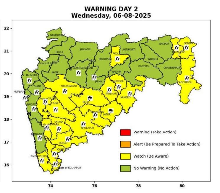 मुंबई वेधशाळेने सिंधुदुर्ग, पुणे, कोल्हापूर, सांगली, सोलापूर, सातारा, अहिल्यानगर, धाराशिव, लातूर, नांदेड, बीड, परभणी, अकोला, गडचिरोली, हिंगोली, भंडारा, गोंदिया हे जिल्हे आणि पुणे घाट परिसरासाठी पावसाचा #यलो अलर्ट दिला