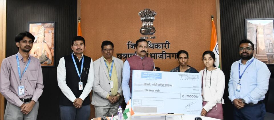 छत्रपती संभाजीनगर, प्रतिनिधी- केंद्र सरकारच्या प्रधानमंत्री जीवन ज्योती विमा योजने अंतर्गत श्रीमती ज्योती अनिल चव्हाण यांना दोन लाख रुपये विमा रकमचे वितरण जिल्हाधिकारी दिलीप स्वामी यांच्या हस्ते करण्यात आले.