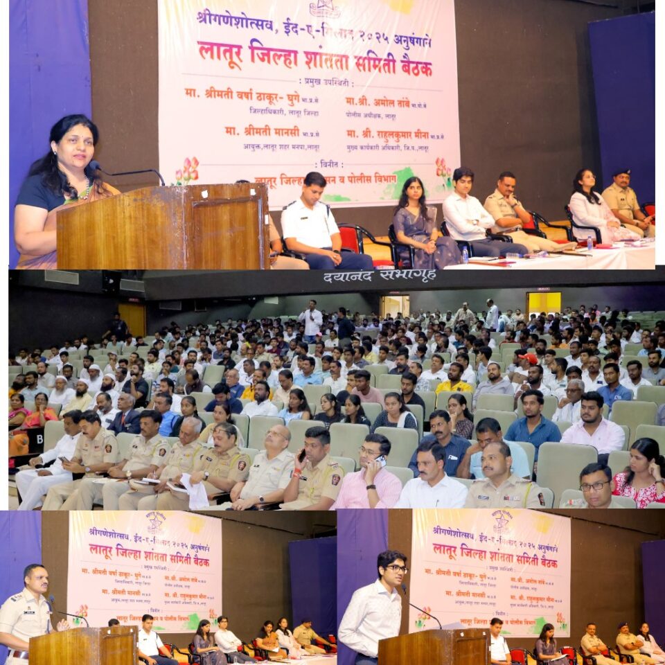 जिल्हाधिकारी श्रीमती ठाकूर-घुगे म्हणाल्या, गणेशोत्सवात ऑपरेशन सिंदूर, स्वदेशी आदी विषयांवर देखावे सादर करावेत. नाविन्यपूर्ण संकल्पना राबवून पर्यावरण संवर्धनाचा संदेश द्यावा. सर्वधर्मीयांनी एकत्र येऊन सामाजिक विश्वास दृढ करावा. गतवर्षी लातूरच्या गणेशोत्सव मंडळाला राज्यस्तरीय तृतीय क्रमांकाचे पारितोषिक मिळाले होते. यंदा प्रथम क्रमांक मिळवण्यासाठी सामाजिक संदेश देणारे उत्कृष्ट देखावे सादर करावेत. डॉल्बीमुक्त गणेशोत्सवासाठी सहकार्य करण्याचे आणि पारंपारिक वाद्यांचा वापर करण्याचे आवाहन त्यांनी यावेळी केले. गणेशोत्सव आणि ईद-ए-मिलाद साजरे करताना सर्वांनी नियमांचे काटेकोर पालन करावे आणि पर्यावरणपूरक उत्सव साजरे करावेत, असेही त्या म्हणाल्या. जिल्हा प्रशासन उत्सवकाळात आवश्यक सुविधा उपलब्ध करेल, असे त्यांनी आश्वासित केले.
