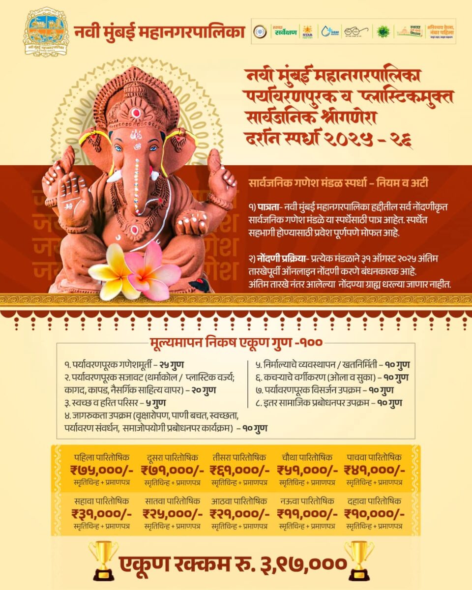 नवी मुंबई महानगरपालिका आयोजित ‘नमुंमपा पर्यावरणपूरक व प्लास्टीकमुक्त सार्वजनिक गणेशदर्शन स्पर्धा 2025- 26’ मध्ये जास्तीत जास्त मंडळांनी सहभागी व्हावे असे नवी मुंबई महानगरपालिकेमार्फत आवाहन करण्यात येत आहे.