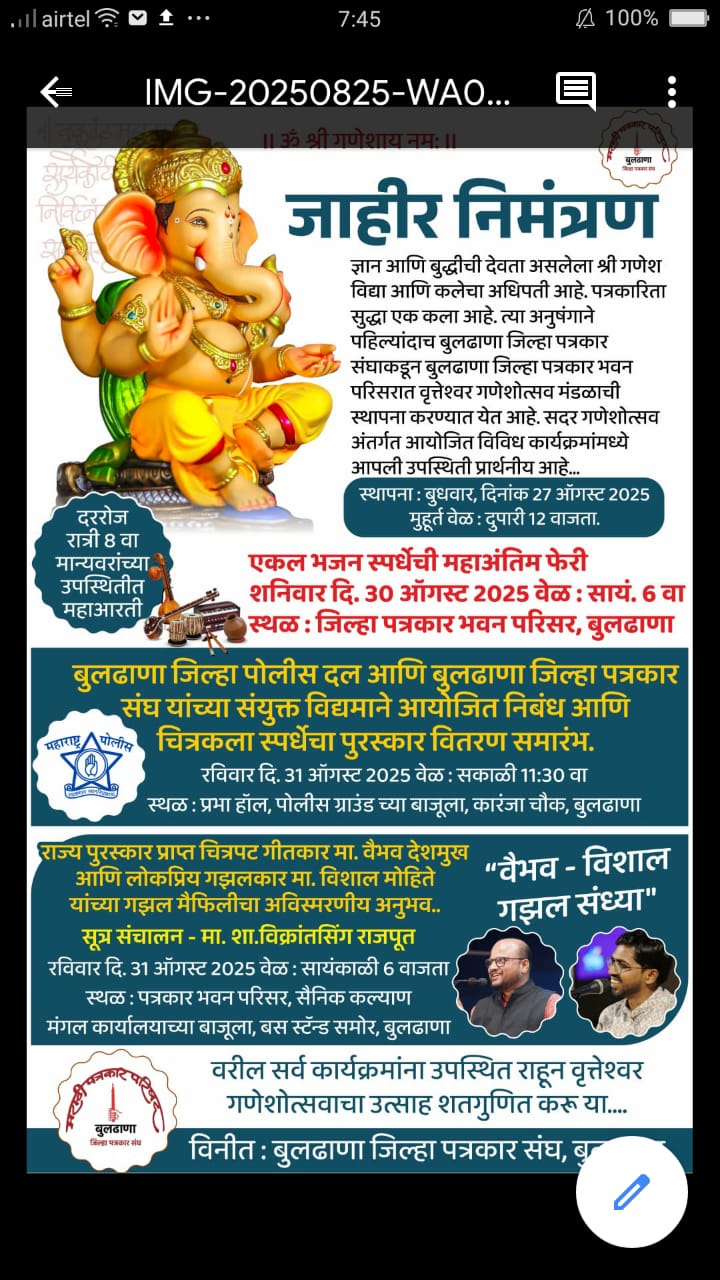 सण – उत्सव सामाजिक एकात्मियतेचे प्रतीक आहे. उत्सव काळात मानवी मूल्यांचा प्रचार आणि प्रसार होत असून, जीवनाला स्तकर्माची दिशाही प्राप्त होते. याच भावनेतून पत्रकार संघातर्गत वृत्तेश्वर गणेश मंडळातर्फे विविध कार्यक्रमांचे आयोजन करण्यात आले आहे. यापैकी एक असलेल्या भजन स्पर्धेची प्रथम फेरी पार पडली. अंतिम फेरीसाठी पात्र ठरलेल्या स्पर्धकांची स्पर्धा शनिवार, ३० ऑगस्ट रोजी होणार आहे. रविवार, ३१ ऑगस्टला सकाळी ११ वाजता जिल्हा पोलीस दल आणि पत्रकार संघाच्या संयुक्त विद्यमाने आयोजित चित्रकला आणि निंबध स्पर्धेचे बक्षीस वितरण शहरातील कारंजा चौकस्थित प्रभा हॉल येथे पार पडेल. यानंतर, सायंकाळी ६ वाजता पत्रकार भवन परिसरात वैभव- विशाल गझल संध्या ही मैफिल रंगणार आहे. सदर कार्यक्रमास उपस्थित राहावे, असे आवाहन पत्रकार संघाचे ज
