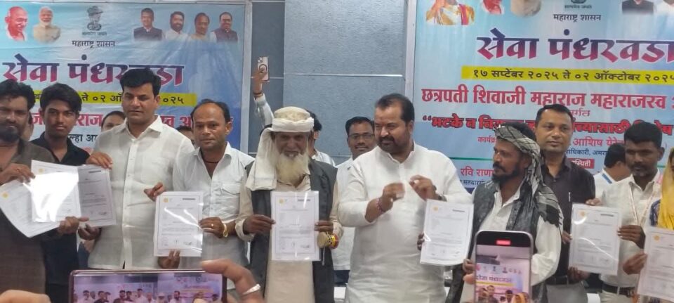 अमरावती, द प्रतिनिधी : सेवा पंधरवड्यानिमित्त महसूल विभागातर्फे महाराजस्व अभियानातून विविध उपक्रम राबविण्यात येत आहे. यात अमरावती तहसिल कार्यालयातर्फे भटके, विमुक्त जातीच्या नागरिकांना विविध लाभाचे वाटप करण्यात आले.   तहसिल कार्यालयातील कार्यक्रमाला आमदार रवि राणा, राजेश वानखडे, उपविभागीय अधिकारी अनिल भटकर, तहसिलदार विजय लोखंडे आदी उपस्थित होते.    श्री. राणा यांनी या उपक्रमामुळे नागरिकांना तातडीने सोयीसुविधा उपलब्ध होत आहेत. घरकुल, पट्टेवाटप यामुळे समाजातील शेवटच्या घटकांना न्याय मिळणार आहे. प्रशासनाच्या या उपक्रमामुळे वंचित घटकांना आधार मिळेल. गावठाणातील घरांसाठी गावाची हद्द वाढविण्याची सूचना आली आहे. त्यामुळे वाढीव गावाला मान्यता मिळणार आहे. येत्या काळात राज्यात सर्वाधिक पट्टे वाटप अमरावतीमध्ये व्हावे, अशी अपेक्षा व्यक्त केली. तसेच पावसामुळे शेतपिकांचे नुकसान झाले आहे. याची माहिती देण्यात आली आहे. त्यामुळे दिवाळीच्या आत शेतकऱ्यांना नुकसान भरपाई देण्यात येणार असल्याचे त्यांनी यावेळी सांगितले.श्री. वानखडे यांनी वंचित घटकांना सर्व सुविधा मिळाव्यात यासाठी घेण्यात आलेल्या कार्यक्रमाचा नागरिकांनी लाभ घ्यावा. प्रत्येकाला घर मिळाल्यास कुटुंबाची स्थायी व्यवस्था होणार आहे. एका ठिकाणी भटक्या, विमुक्त जाती स्थायी झाल्यास त्यांना शासनाच्या योजनांचा लाभ मिळण्यास मदत होणार असल्याचे सांगितले.