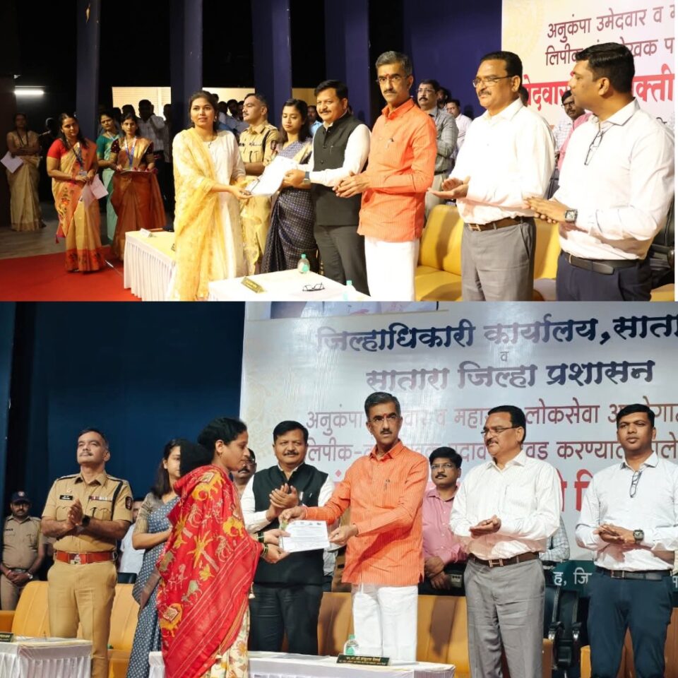 जिल्हाधिकारी कार्यालय, सातारा व जिल्हा प्रशासन यांच्यावतीने अनुकंपा उमेदवार व महाराष्ट्र लोकसेवा आयोगाद्वारे लिपिक टंकलेखक पदावर निवड झालेल्या उमेदवारांना नियुक्ती आदेशांचे वितरण कार्यक्रम पालकमंत्री श्री. देसाई यांच्या अध्यक्षेतेखाली स्व. यशवंतराव चव्हाण बहुउद्देशीय सभागृह सातारा येथे झाला.यावेळी जिल्हाधिकारी संतोष पाटील, मुख्यकार्यकारी अधिकारी याशनी नागराज, अप्पर जिल्हाधिकारी मल्लिकार्जुन माने, सार्वजनिक बांधकाम विभागाचे अधीक्षक अभियंता संतोष रोकडे, निवासी उपजिल्हाधिकारी नागेश पाटील, उपजिल्हाधिकारी (महसूल) विक्रांत चव्हाण, तहसीलदार शशिकांत जाधव आदी उपस्थित होते.
