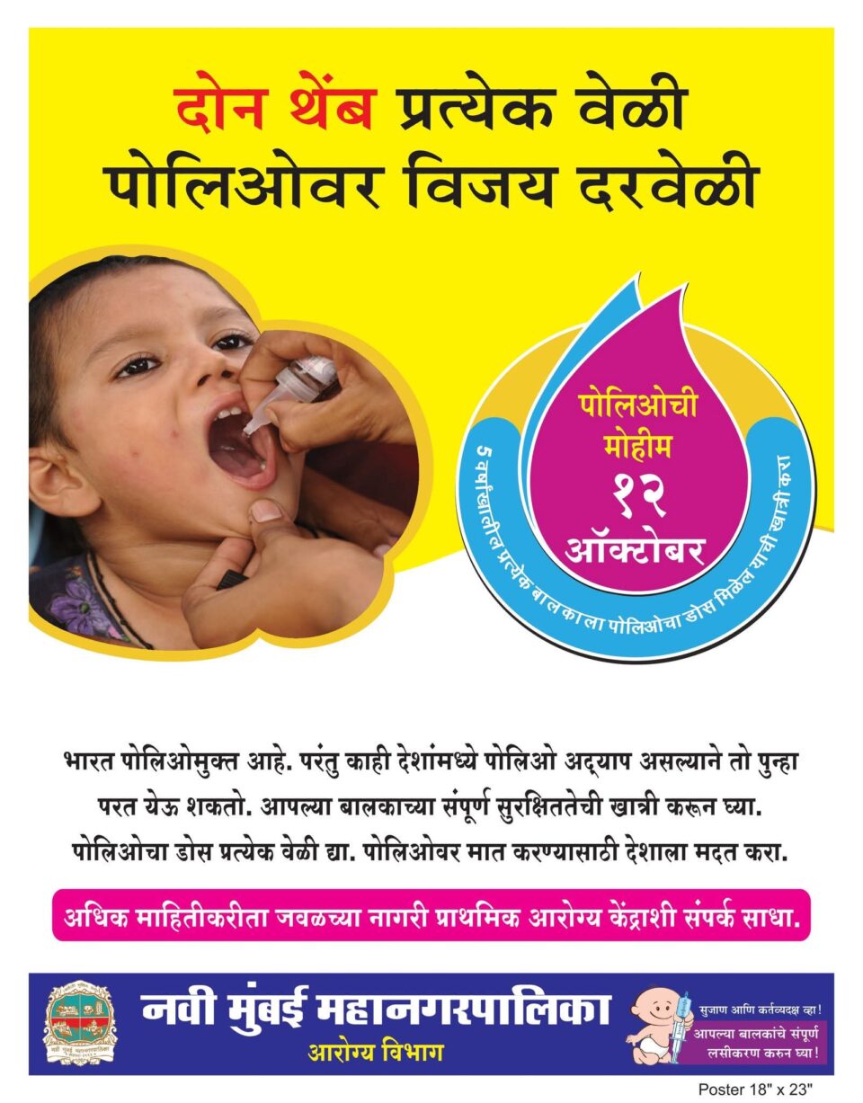 नवी मुंबई प्रतिनिधी  – नवी मुंबई महानगरपालिका कार्यक्षेत्रात रविवार दि. १२ ऑक्टोबर २०२५ रोजी उपराष्ट्रीय पल्स पोलिओ लसीकरण मोहीम राबविण्यात येत आहे. यामध्ये ० ते ५ वयोगटातील प्रत्येक बालकाला पोलिओ लसीकरण करण्यात येणार असून महापालिका आयुक्त डॉ. कैलास शिंदे यांच्या मार्गदर्शनाखाली आरोग्य विभागाने पोलिओ लसीकरणाचे सुयोग्य नियोजन केले आहे.