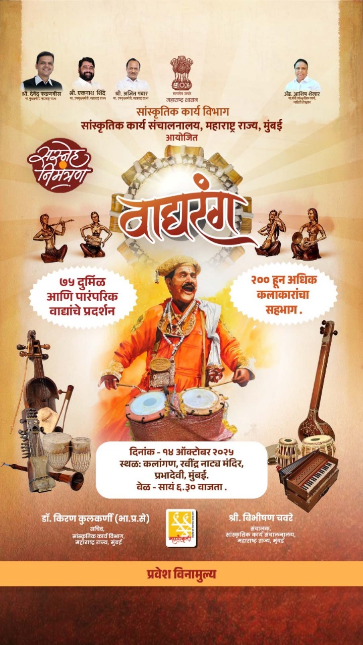 वाद्यरंग हा भव्य सांस्कृतिक कार्यक्रम १४ ऑक्टोबर, २०२५ रोजी सायंकाळी ६:३० वाजता कलांगण, रविंद्र नाट्यमंदीर, प्रभादेवी, मुंबई या ठिकाणी आयोजित करण्यात येणार आहे. रसिक प्रेक्षकांनी या कार्यक्रमाचा आस्वाद घ्यावा, असे आवाहन सांस्कृतिक कार्य संचालनालयाचे संचालक विभीषण चवरे यांनी केले आहे.