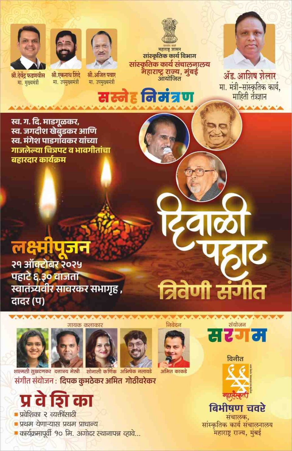 दिवाळी पहाट’ कार्यक्रम ; दादरला २१, मुलुंड येथे २२ ऑक्टोबरला…