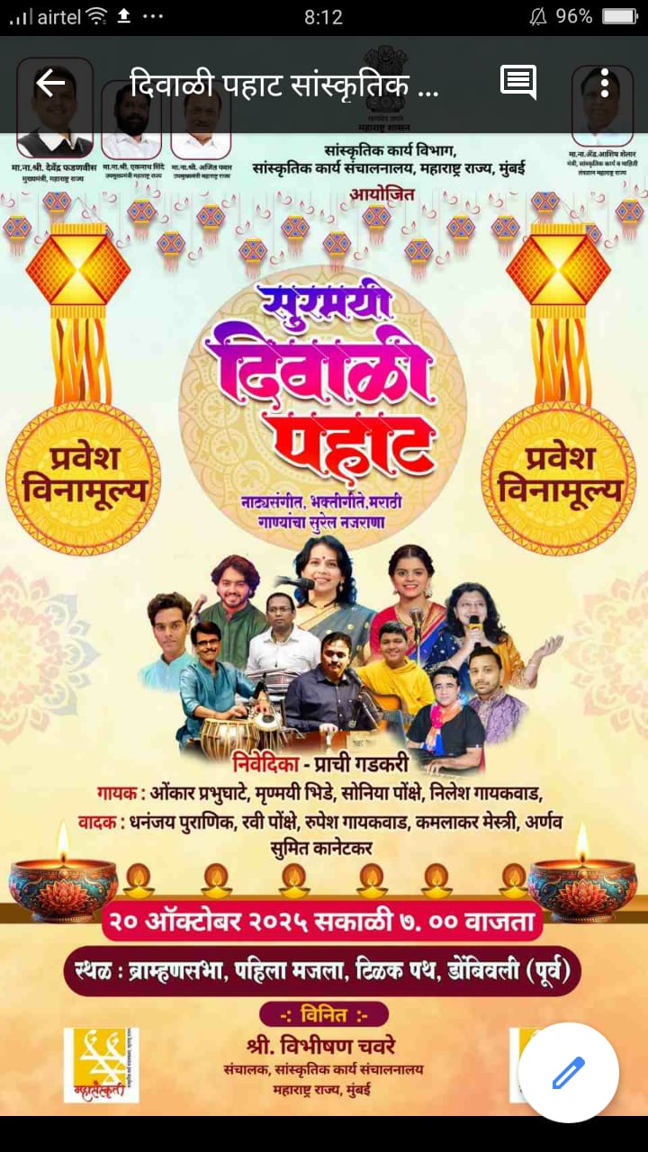 दिवाळी पहाट’ कार्यक्रम दादरला २१, मुलुंड येथे २२ ऑक्टोबरला