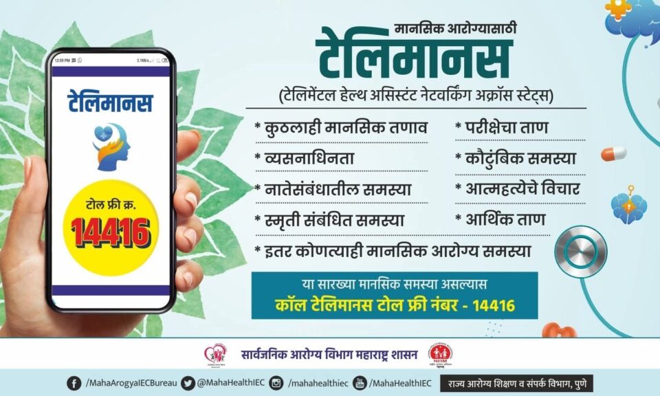 केंद्र सरकारतर्फे उपलब्ध करून देण्यात आलेली ‘टेली-मानस’ टोल फ्री हेल्पलाइन १४४१६ ही मोफत सेवा सर्वसामान्यांसाठी २४×७ उपलब्ध आहे. प्रशिक्षित मानसोपचारतज्ञ व समुपदेशक या क्रमांकावर त्वरित मार्गदर्शन करून नागरिकांना मानसिक ताणातून बाहेर पडण्यासाठी मदत करतात. कोणत्याही प्रकारच्या मानसिक अस्वस्थतेसाठी ही सेवा निःसंकोचपणे वापरण्याचे आवाहन जिल्हा आरोग्य अधिकारी डॉ. गंगाधर परगे यांनी केले आहे.टेली-मानसद्वारे उपलब्ध सेवा :
