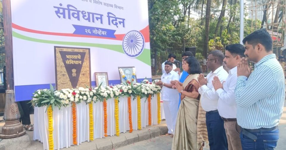 भारतीय संविधानाच्या ७५ वर्षपूर्ती निमित्त सामाजिक न्याय विभागामार्फत ‘घर घर संविधान’ या उपक्रमांतर्गत संविधान दिन कार्यक्रमाचे आयोजन करण्यात आले. परळ येथील डॉ. बाबासाहेब आंबेडकर यांच्या वास्तव्य असलेल्या बी.आय.टी. चाळ येथे झालेल्या अभिवादन कार्यक्रमाने संविधान दिनाचा आरंभ झाला.