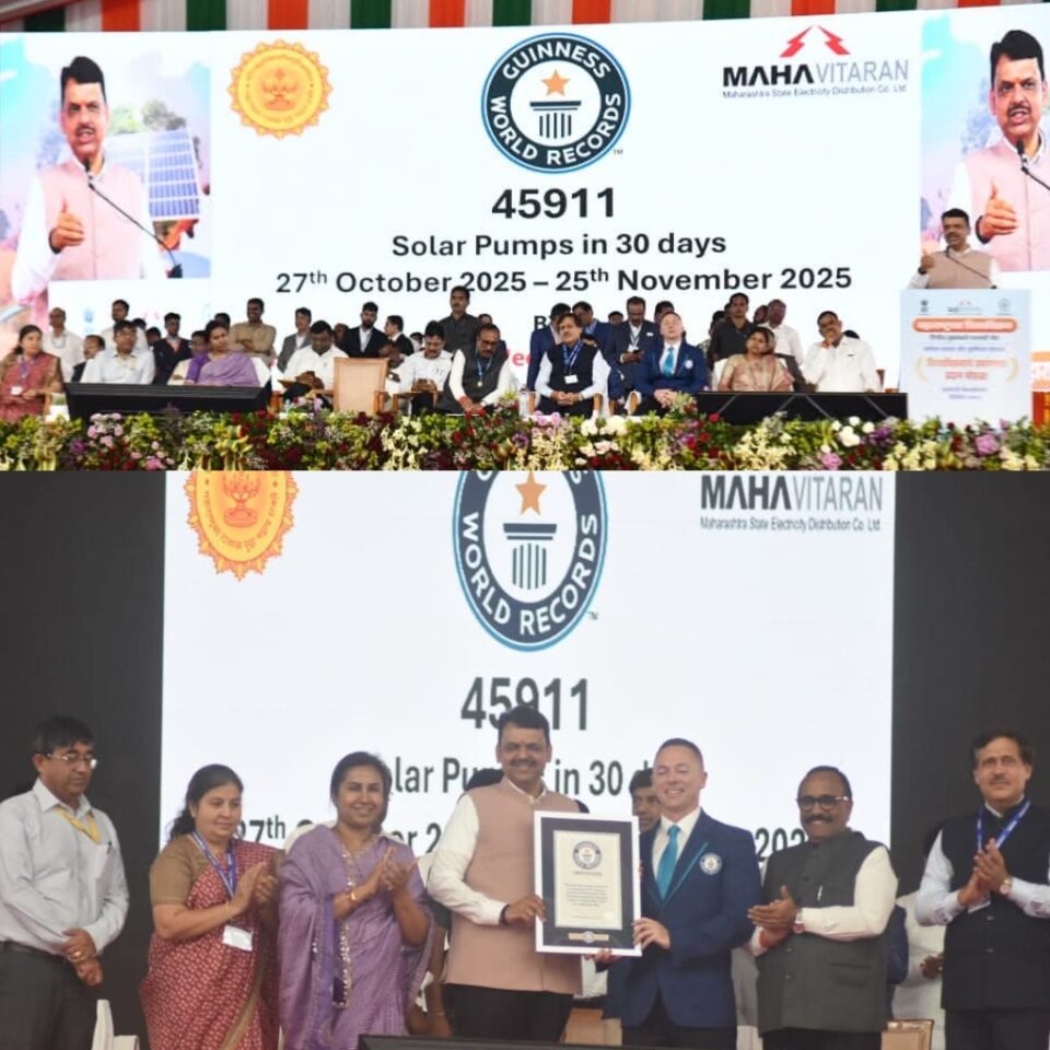 ‘मागेल त्याला सौर कृषीपंप’ योजनेत महाराष्ट्राने विश्वविक्रम केला आहे. महावितरणने एकाच महिन्यात ४५ हजार ९११ सौर कृषीपंप स्थापित करण्याचा उच्चांक गाठला. या विक्रमाची गिनिज बुकमध्ये यशस्वी नोंद झाली. गिनीज बुकतर्फे विश्वविक्रम प्रमाणपत्र प्रदान सोहळा आज छत्रपती संभाजीनगरच्या शेंद्रा एमआयडीसीमध्ये ऑरिक सिटी मैदानावर पार पडला. या सोहळ्यास मुख्यमंत्री देवेंद्र फडणवीस यांची प्रमुख उपस्थिती होती. या विश्वविक्रमाची घोषणा करण्यासाठी गिनीज बुक ऑफ वर्ल्ड रेकॉर्ड्सचे कार्ल सॅबेले हे ही यावेळी उपस्थित होते.- या सोहळ्यास राज्याचे इमाव बहुजन कल्याण व अपारंपारिक ऊर्जा मंत्री अतुल सावे,राज्यमंत्री मेघना साकोरे बोर्डीकर, विधान परिषद सदस्य आ. संजय केणेकर, आ. अनुराधा चव्हाण, आ. नारायण कुचे,आ. प्रशांत बंब,आ. सुरेश धस, मुख्यमंत्र्यांचे आर्थिक सल्लागार तथा मित्राचे संचालक प्रवीण परदेशी, ऊर्जा विभागाच्या अपर मुख्य सचिव आभा शुक्ला, महावितरणचे अध्यक्ष तथा व्यवस्थापकीय संचालक लोकेश चंद्र, सहव्यवस्थापकीय संचालक आदित्य जिवने, सहसचिव (ऊर्जा) नारायण कराड, स्वतंत्र संचालक विश्वास पाठक, संचालक सचिन तालेवार (संचालन/प्रकल्प), योगेश गडकरी (वाणिज्य), राजेंद्र पवार (मानव संसाधन), कार्यकारी संचालक धनंजय औंढेकर, मुख्य अभियंता पवनकुमार कछोट तसेच अभिनेते संदीप पाठक, योगेश शिरसाट आदी मान्यवर उपस्थित होते: पंच कार्ल सॅबेले यांनी केली विक्रमाची घोषणासुरुवातीला मुख्यमंत्र्यांच्या हस्ते राज्यातील सौरकृषी पंपाचे डिजिटल लोकार्पण करुन त्यांनी लाभार्थी शेतकऱ्यांशी दुरदूष्य प्रणालीने संवाद साधला. त्यानंतर गिनीज बुक विक्रम नोंदचे निरीक्षक पंच कार्ल सॅबेले यांनी विक्रमाची घोषणा केली. त्यानंतर त्यांनी प्रमाणपत्र व मेडल मान्यवरांना प्रदान केले. सौर कृषी पंप योजनेसाठी अर्थसहाय्य करणाऱ्या AIIM बॅंकेसोबतच्या करारावर स्वाक्षऱ्या करण्यात आल्या. बॅंकेचे प्रत्युष मिश्रा व महावितरणच्या अधिकाऱ्यांनी या करारावर स्वाक्षऱ्या केल्या.