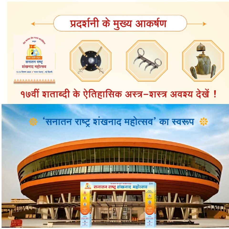 राज्य प्रतिनिधी- नवी दिल्लीतील प्रतिष्ठित ‘भारत मंडपम्’ (इंद्रप्रस्थ) येथे १३ ते १५ डिसेंबर रोजी आयोजित होत असलेल्या ‘सनातन राष्ट्र शंखनाद महोत्सवा’त छत्रपती शिवाजी महाराजांच्या काळातील सुमारे २५० हून अधिक दुर्मिळ आणि ऐतिहासिक शस्त्रे दिल्लीमध्ये प्रदर्शित होत आहेत. ही सर्व शस्त्रे महाराष्ट्रातून विशेष सुरक्षा व्यवस्थेत दिल्लीला आणली जात असून राजधानीत अशा ऐतिहासिक स्वरूपाचे शस्त्रप्रदर्शन पाहायला मिळणार आहे. ‘सेव्ह कल्चर, सेव्ह भारत फाउंडेशन’ प्रस्तुत आणि सनातन संस्था आयोजित महोत्सवात या शिवकालीन शस्त्रप्रदर्शनाद्वारे ‘शौर्याचा शंखनाद’ होणार आहे, *अशी माहिती सनातन संस्थेचे राष्ट्रीय प्रवक्ते श्री. अभय वर्तक यांनी दिली आहे.