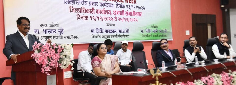 छत्रपती संभाजीनगर, प्रतिनिधी समाजातील शेवटच्या घटकापर्यंत शासकीय योजनांचा लाभ देण्यासाठी नागरिकांची संवाद संवेदनशील आणि तंत्रज्ञानाचा प्रभावी वापर करून गतिशीलतेने काम केल्याने सुशासन होईल असा विश्वास विभागीय आयुक्त जितेंद्र पापळकर यांनी व्यक्त केला. जिल्हाधिकारी कार्यालयात सुशासन सप्ताह निमित्त जिल्हास्तरीय प्रसार कार्यशाळेत आयोजन जिल्हा नियोजन समिती सभागृहात करण्यात आले होते. या कार्यशाळेत निवृत्त विभागीय आयुक्त भास्कर मुंडे, जिल्हाधिकारी दिलीप स्वामी, जिल्हा परिषदचे मुख्य कार्यकारी अधिकारी श्री. अंकित, अपर पोलीस अधीक्षक अन्नपूर्णा सिंह, सामान्य प्रशासन विभागाच्या उपजिल्हाधिकारी संगीता राठोड, यांच्यासह विविध कार्यालयाचे विभाग प्रमुख.व अधिकारी ,कर्मचारी उपस्थित होते.