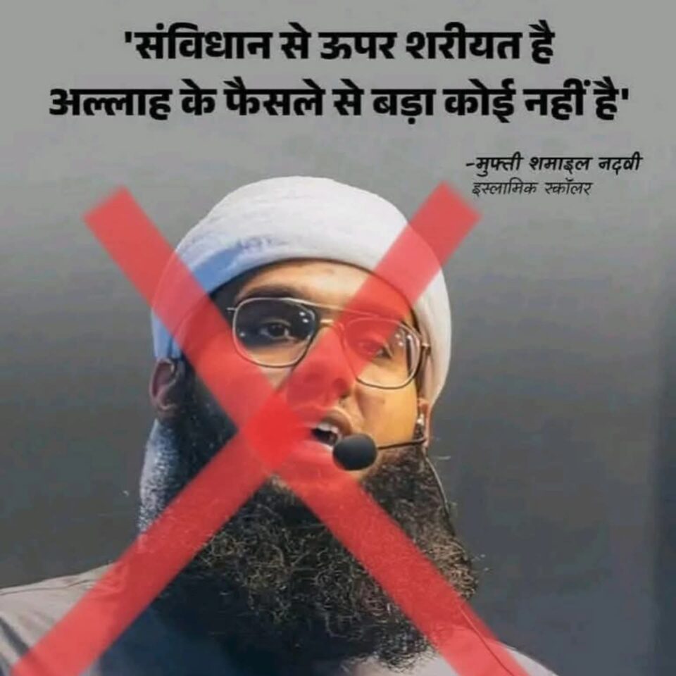 इस्लामिक धर्मगुरू मुफ्ती शमाईल नदवी याचे “शरीयत आमच्यासाठी संविधानापेक्षा श्रेष्ठ आहे” हे विधान अत्यंत गंभीर, धोकादायक व स्पष्टपणे संविधानविरोधी आहे. अशा प्रकारची विधाने केवळ कायद्याच्या राज्यालाच नव्हे तर देशाच्या एकात्मता, सामाजिक सलोखा व लोकशाही मूल्यांनाही गंभीर धोका निर्माण करणारी आहेत. ही मानसिकता भारताच्या संविधानिक व्यवस्थेला नाकारणारी व समांतर धार्मिक प्रभुत्व प्रस्थापित करण्याचा प्रयत्न दर्शवते.