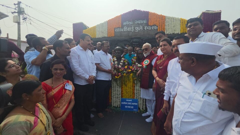 सातारा प्रतिनिधी क्रांतिज्योती सावित्रीबाई फुले यांच्या १९५ व्या जयंतीनिमित्त त्यांचे जन्मगाव असलेल्या खंडाळा तालुक्यातील नायगाव येथील स्मारकास अन्न, नागरी पुरवठा व ग्राहक संरक्षण मंत्री छगन भुजबळ यांनी पुष्पहार अर्पण करून अभिवादन केले. यावेळी विविध संस्थांचे पदाधिकारी उपस्थित होते.
