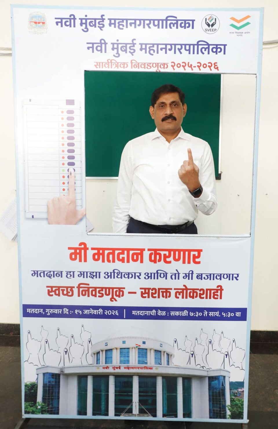 नवी मुंबई प्रतिनिधी-     सध्याच्या सोशल मीडियाप्रेमी युगात सेल्फी छायाचित्रे काढून समाज माध्यमांवर अपलोड करण्याची लोकांची आवड लक्षात घेऊन नमुंमपा सार्वत्रिक निवडणूक 2025-26 च्या पार्श्वभूमीवर नवी मुंबई महानगरपालिकेच्या वतीने महानगरपालिका मुख्यालयासह सर्व कार्यालये, निवडणूक निर्णय अधिकारी यांची कार्यालये, विष्णुदास भावे नाट्यगृह, भारतरत्न डॉ.बाबासाहेब आंबेडकर स्मारक तसेच वंडर्स पार्क, सेंट्रल पार्क अशी उद्याने, रूग्णालये, मॉल्स, डी मार्ट सारखी वर्दळीची ठिकाणे येथे मतदानाविषयी जनजागृती करणारे सेल्फी बुथ उभारण्यात आले आहेत. या सेल्फी बूथवर नागरिक उत्साहाने छायाचित्रे काढत असून आपल्या समाज माध्यमांवर अपलोड करून इतरांनाही मतदानाचे आवाहन करीत आहेत.