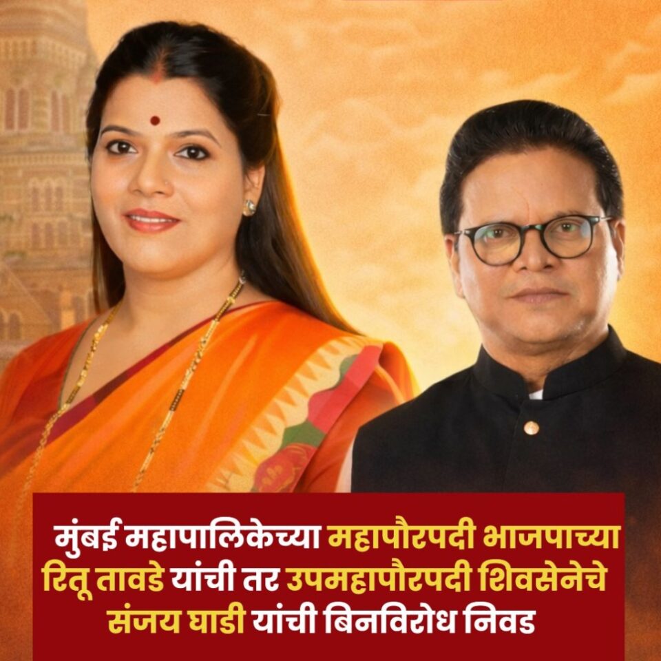 आज मुंबई महापालिकेच्या महापौरपदी भाजपाच्या रितू तावडे तर उपमहापौरपदी शिवसेनेचे संजय घाडी यांची बिनविरोध निवड….