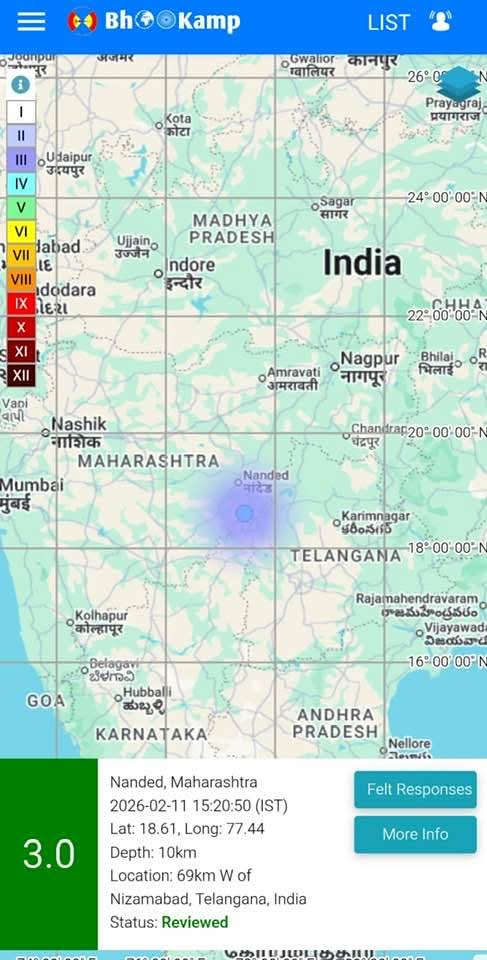 त्यानुसार राष्ट्रीय भूकंप विज्ञान केंद्राच्या संकेतस्थळावर तपासले असता दिनांक 11 फेब्रुवारी 2026 रोजी दुपारी 1520 Hrs. वाजता या धक्क्याची नोंद झाली असून या धक्क्याची तीव्रता रिश्टर स्केलवर 3.0 एवढी नोंदविण्यात आली असून याचा केंद्रबिंदु नांदेड जिल्ह्यातील मुखेड तालुक्यातील खपराळ गावाजवळ असल्याचे कळते. सदर धक्का हा अतिसौम्य प्रकारचा आहे तसेच या धक्क्यामुळे कुठलीही जीवित व वित्त हानी झाली नसल्याबाबत तहसीलदार #मुखेड यांनी जिल्हा आपत्कालीन कार्यकेंद्रास कळविले आहे.