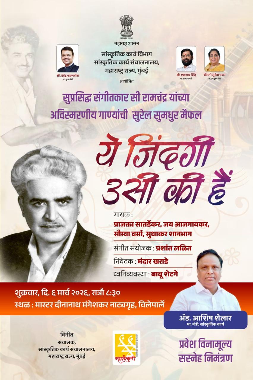 सांस्कृतिक प्रतिनिधी-मुंबई,  : महाराष्ट्र शासनाच्या सांस्कृतिक कार्य विभाग आणि सांस्कृतिक कार्य संचालनालय यांच्या वतीने सुप्रसिध्द संगीतकार सी रामचंद्र यांच्या अविस्मरणीय गाण्यांची सुरेलसुमधुर मैफल “ये जिंदगी उसी की है” या सांस्कृतिक कार्यक्रमाचे आयोजन शुक्रवार, ६ मार्च, २०२६ रोजी, रात्री ८.३० वाजता मास्टर दीनानाथ मंगेशकर नाट्यगृहृ विलेपार्ले येथे करण्यात आले आहे.