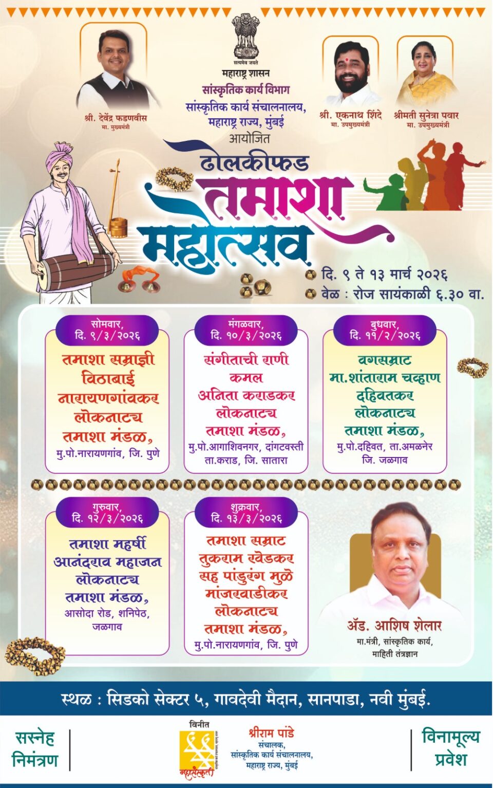 हा कार्यक्रम ९ मार्च ते १३ मार्च, २०२६ या कालावधीत सायंकाळी ६.३० वा. सिडको सेक्टर ५, गांवदेवी मैदान, सानपाडा, नवी मुंबई येथे संपन्न होणार आहे. ९ मार्च,२०२६ रोजी तमाशा सम्राज्ञी विठाबाई नारायणगांवकर लोकनाट्य तमाशा मंडळ, मु.पो.नाराणगांव, जि.पुणे; १० मार्च, २०२६ रोजी संगीताची राणी कमल अनिल कराडकर लोकनाट्य तमाशा मंडळ, मु.पो.आगाशिवनगर, दांगटवस्ती, ता.कराड, जि.सातारा; ११ मार्च, २०२६ रोजी वगसम्राट मा.शांताराम चव्हाण दहिवतकर लोकनाट्य तमाशा मंडळ, मु.पो.दहिवत, ता.अमळनेर, जि.जळगांव; १२ मार्च,२०२६ रोजी तमाशा महर्षी आनंदराव महाजन लोकनाट्य तमाशा मंडळ, आसोदा रोड, शनिपेठ, जळगाव; १३ मार्च,२०२६ रोजी तमाशा सम्राट तुकाराम खेडकर सह पांडुरंग मुळे मांजरवाडीकर लोकनाट्य तमाशा मंडळ, मु.पो.नारायणगांव, जि.पुणे यांचे सादरीकरण होणार आहे.