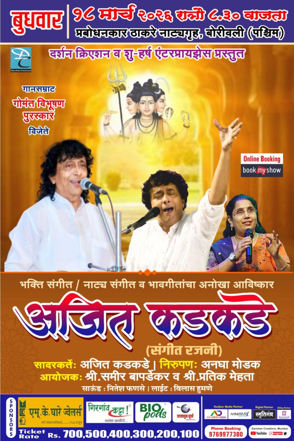 *मुंबई,* प्रतिनिधी भक्तीगीतांच्या सुमधुर सादरीकरणाने आणि भावस्पर्शी गायनशैलीने रसिकांच्या मनावर अधिराज्य गाजवणारे प्रख्यात ज्येष्ठ गायक, गानसम्राट गोमंतक पद्मविभूषण पुरस्कार सन्मानित पं. अजितकुमार कडकडे यांची विशेष ‘संगीत रजनी’ दिनांक १८ मार्च,रोजी, रात्री ८.३० वा बोरीवली येथे आयोजित करण्यात आली आहे.