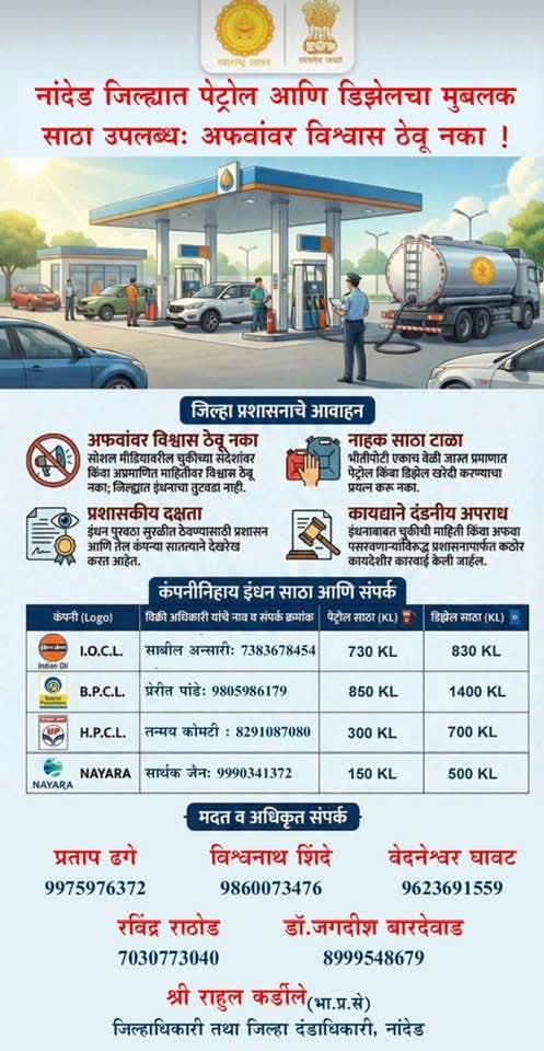 तर मित्रानो नांदेड जिल्ह्यात मोठ्या प्रमाणात पेट्रोल/डिझेल उपलब्ध आहे. फक्त पंपावर ग्राहकांनी पॅनिक खरेदी बंद केली आणि अनावश्यक गर्दी कमी केली तर संपूर्ण जिल्ह्याला अडचण येणार नाही.म्हणून मित्रानो अशा परिस्थितीत आपण आपल्याला साथ देऊया अफवांवर अविश्वास दाखवूया.