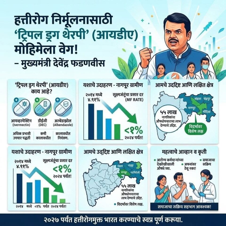 मुख्यमंत्री Devendra Fadnavis यांच्या नेतृत्वाखाली महाराष्ट्रात हत्तीरोग (Lymphatic Filariasis) निर्मूलनासाठी ‘ट्रिपल ड्रग थेरपी’ (IDA) मोहिमेला वेग देण्यात येत आहे.👉 या उपचारामध्ये Ivermectin + DEC + Albendazole या तीन औषधांचा समावेश असून, ही पद्धत अधिक प्रभावी मानली जाते