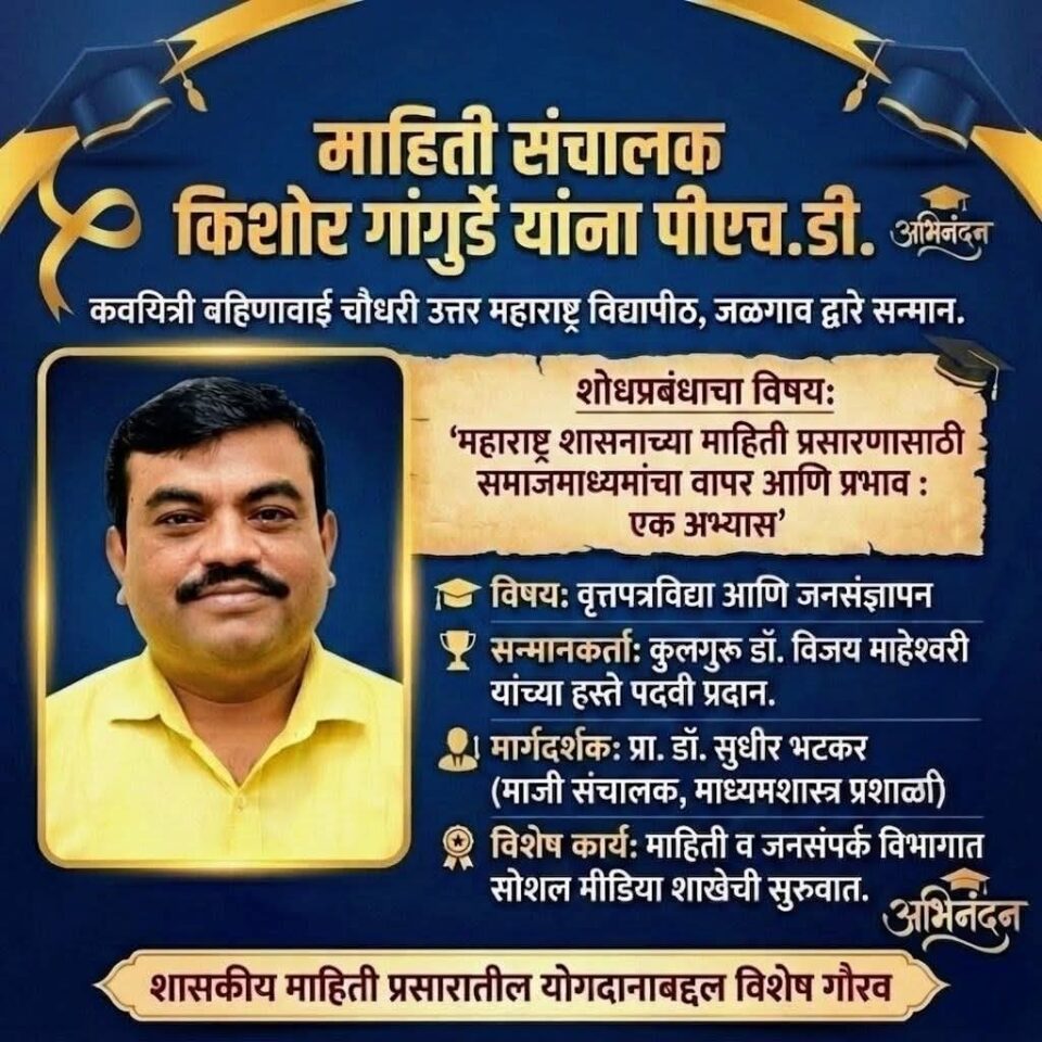 ‘सोशल मीडिया’ वरील संशोधनासाठी माहिती संचालक किशोर गांगुर्डे यांना पीएच.डी.