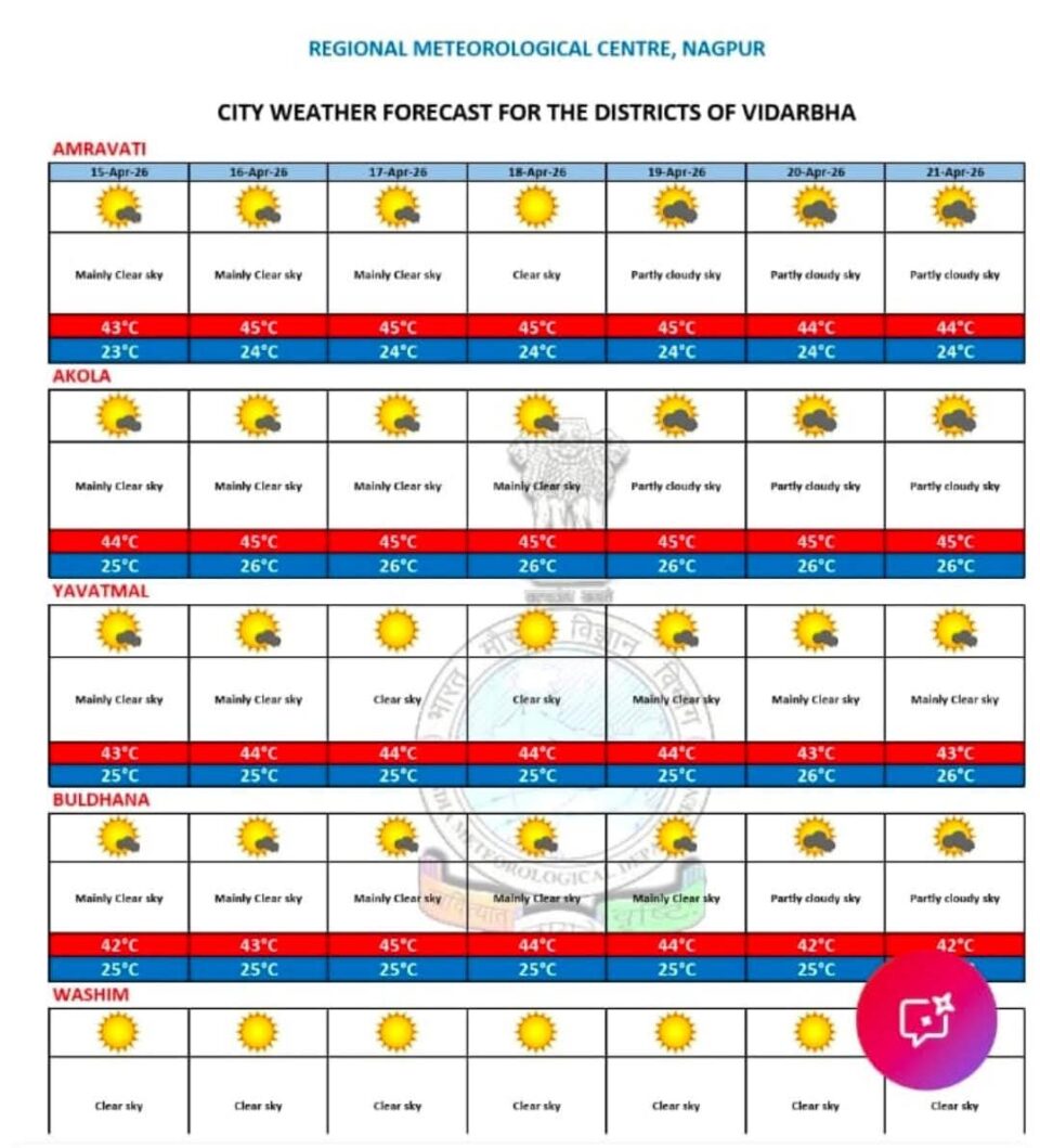 उष्णतेच्या लाटेबाबत इशारा / Heat Wave Advisoryभारत हवामान विभागाच्या प्रादेशिक हवामान केंद्र, नागपूर यांनी विदर्भातील अकोला, अमरावती आणि वर्धा जिल्ह्यांसाठी पुढील दोन दिवस उष्णतेच्या लाटेची (Heat Wave) चेतावणी जारी केली आहे. तसेच विदर्भातील इतर भागांमध्येही कमाल तापमान सामान्यापेक्षा सुमारे ३–४°से. अधिक राहण्याची शक्यता आहे. त्यामुळे नागरिकांनी आवश्यक ती काळजी घ्यावी.उष्णतेच्या लाटेदरम्यान घ्यावयाची काळजी (IMD मार्गदर्शक तत्त्वे):* शक्यतो दुपारी १२ ते ३ या वेळेत बाहेर जाणे टाळावे.* पुरेसे पाणी प्या, तहान नसली तरी नियमितपणे द्रवपदार्थ घ्यावेत.* हलके, सैल आणि फिकट रंगाचे सूती कपडे परिधान करावेत.* बाहेर पडताना टोपी, छत्री किंवा ओला कापड वापरून डोके झाकावे.* मद्यपान, चहा, कॉफी आणि कार्बोनेटेड पेये कमी प्रमाणात घ्यावीत, कारण त्यामुळे शरीरातील पाण्याची कमतरता वाढू शकते.* लहान मुले, वृद्ध आणि आजारी व्यक्तींनी विशेष काळजी घ्यावी.* जनावरांना सावलीत ठेवावे व त्यांना पुरेसे स्वच्छ पाणी द्यावे.* उष्माघाताची लक्षणे (डोकेदुखी, चक्कर येणे, मळमळ, जास्त घाम येणे) जाणवली तर त्वरित सावलीत विश्रांती घ्यावी व आवश्यक असल्यास वैद्यकीय मदत घ्यावी.नागरिकांनी सतर्क राहून हवामान विभागाच्या पुढील सूचना व अद्ययावत माहितीकडे लक्ष द्यावे.भारत हवामान विभागप्रादेशिक हवामान केंद्र, नागपूर