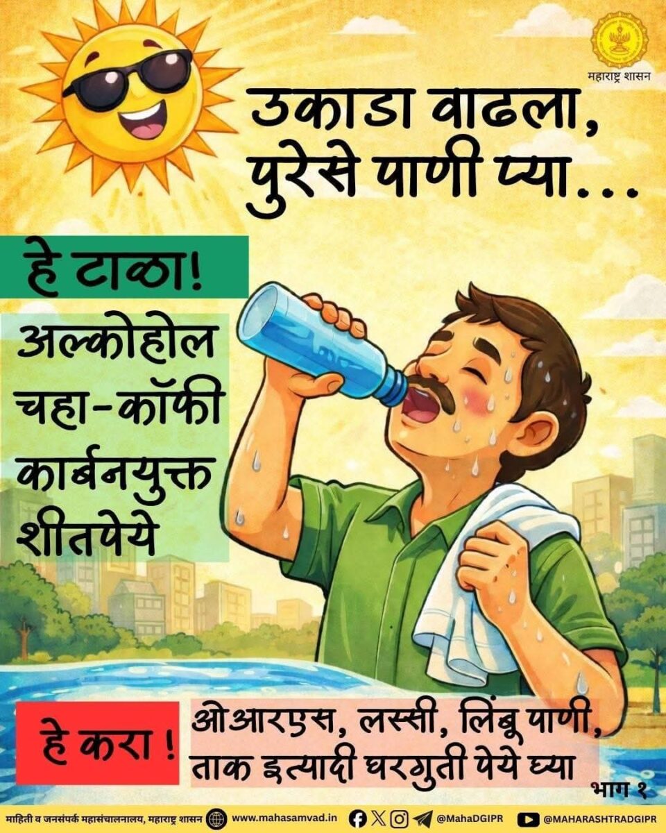 – उष्णतेच्या लाटेच्या माहितीसाठी रेडीओ, टी.व्ही. किंवा वर्तमानपत्रातील माहितीचा वापर करावा. कामगारांसाठी व कामाच्या ठिकाणच्या सूचना उन्हात काम करीत असल्यास कामगारांनी डोक्यावर टोपी किंवा पांढरा रुमाल बांधावा किंवा छत्रीचा वापर करावा. कामाच्या ठिकाणी जवळच थंड पिण्याच्या पाण्याची व्यवस्था करण्यात यावी.- पहाटेच्या वेळी जास्तीत जास्त कामाचा निपटारा करण्यात यावा आणि बाहेर उन्हात काम करीत असतांना थोड्या-थोड्या अंतराने विश्रांती घ्यावी.- सूर्य प्रकाशाचा थेट संबंध टाळण्यासाठी कामगारांना सूचित करण्यात यावे. गरोदर स्त्रिया व आजारी कामगारांची अधिक काळजी घेण्यात यावी.काय करू नये ?- दुपारी १२.०० ते ०३.०० वाजेदरम्यान घराबाहेर जाणे टाळा. उन्हात अतिकष्टाचे कामे करू नका.- बाहेर तापमान जास्त असल्यास शारिरीक श्रमाची कामे टाळावीत.- गडद, घट्ट व जाड कपडे घालण्याचे टाळावे.- दारु, चहा, कॉफी व कार्बोनेटेड थंड पेये घेऊ नका. उच्च प्रथिनयुक्त आहार आणि शिळे अन्न खाऊ नका.- उन्हाच्या कालावधीत शक्यतो स्वयंपाक करण्याचे टाळावे व मोकळ्या हवेसाठी स्वयंपाक घराची दारे आणि खिडक्या उघड्या ठेवाव्यात.पशू-प्राण्यांची काळजी आणि आपत्कालीन संपर्क – गुरांना आणि पाळीव प्राण्यांना सावलीत ठेवावे आणि त्यांना वेळेवर व पुरेसे पिण्याचे पाणी द्यावे.- लहान मुलांना किंवा पाळीव प्राण्यांना बंद असलेल्या व पार्क केलेल्या वाहनात ठेवू नये. उष्माघाताची लक्षणे दिसताच सर्व नागरिकांनी तात्काळ डॉक्टरांशी संपर्क साधावा.- मदतीसाठी व आपत्कालीन परिस्थितीमध्ये नागरिकांनी १०७७, १०२, १०४, १०८ व ११२ या क्रमांकांवर संपर्क साधावा.