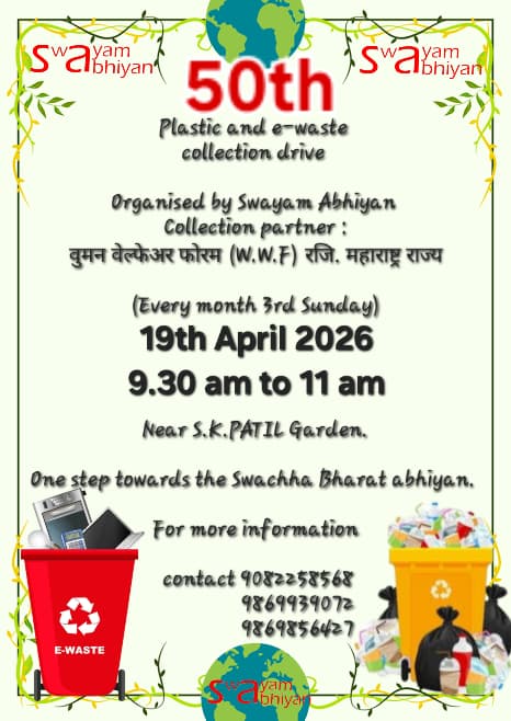 आज*Not out 50…*स्वयम अभियान आणि W. W. F* च्या संयुक्त विद्यमाने प्लास्टिक आणि e-waste कलेक्शनचा ५० वा ड्रॉईव्ह