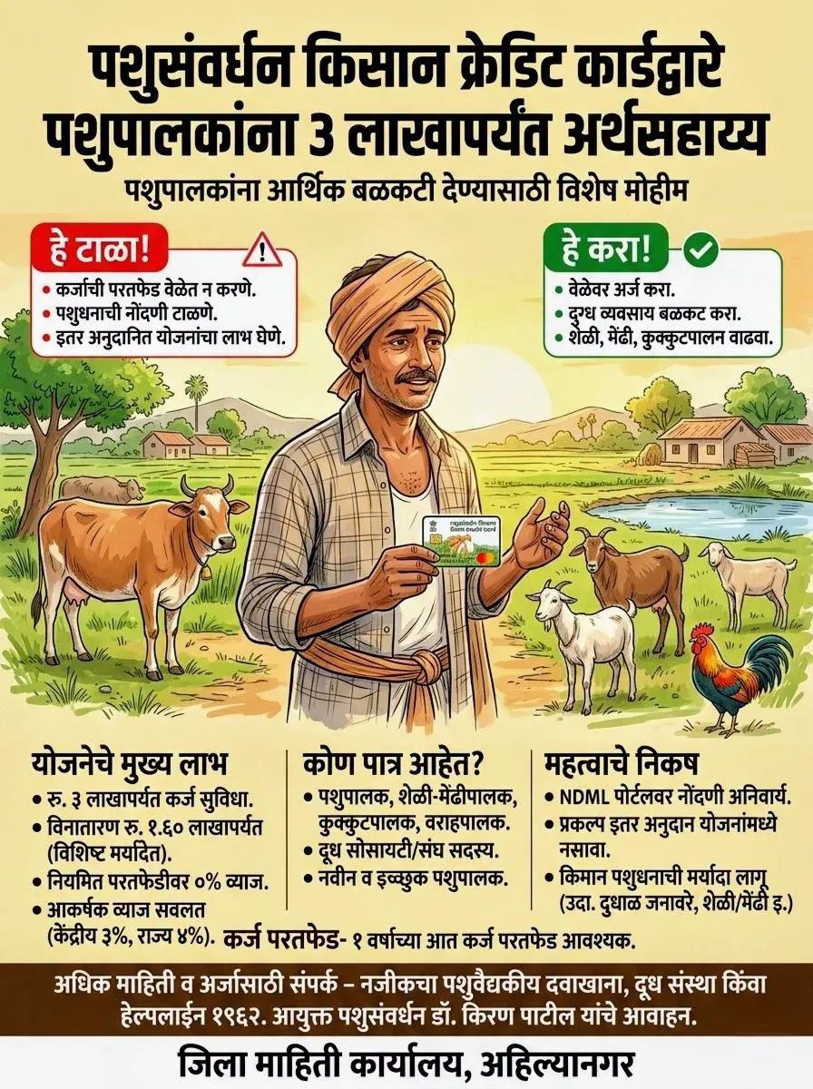 अहिल्यानगर, प्रतिनिधी :- राज्यातील पशुपालकांना आर्थिक बळकटी देण्यासाठी पशुसंवर्धन विभागामार्फत ‘पशुसंवर्धन किसान क्रेडिट कार्ड’ मोहिम राबविण्यात येत असून या योजनेतून पात्र पशुपालकांना ३ लाख रुपयांपर्यंत कर्जसुविधा उपलब्ध होणार असल्याची माहिती आयुक्त पशुसंवर्धन डॉ. किरण पाटील यांनी दिली